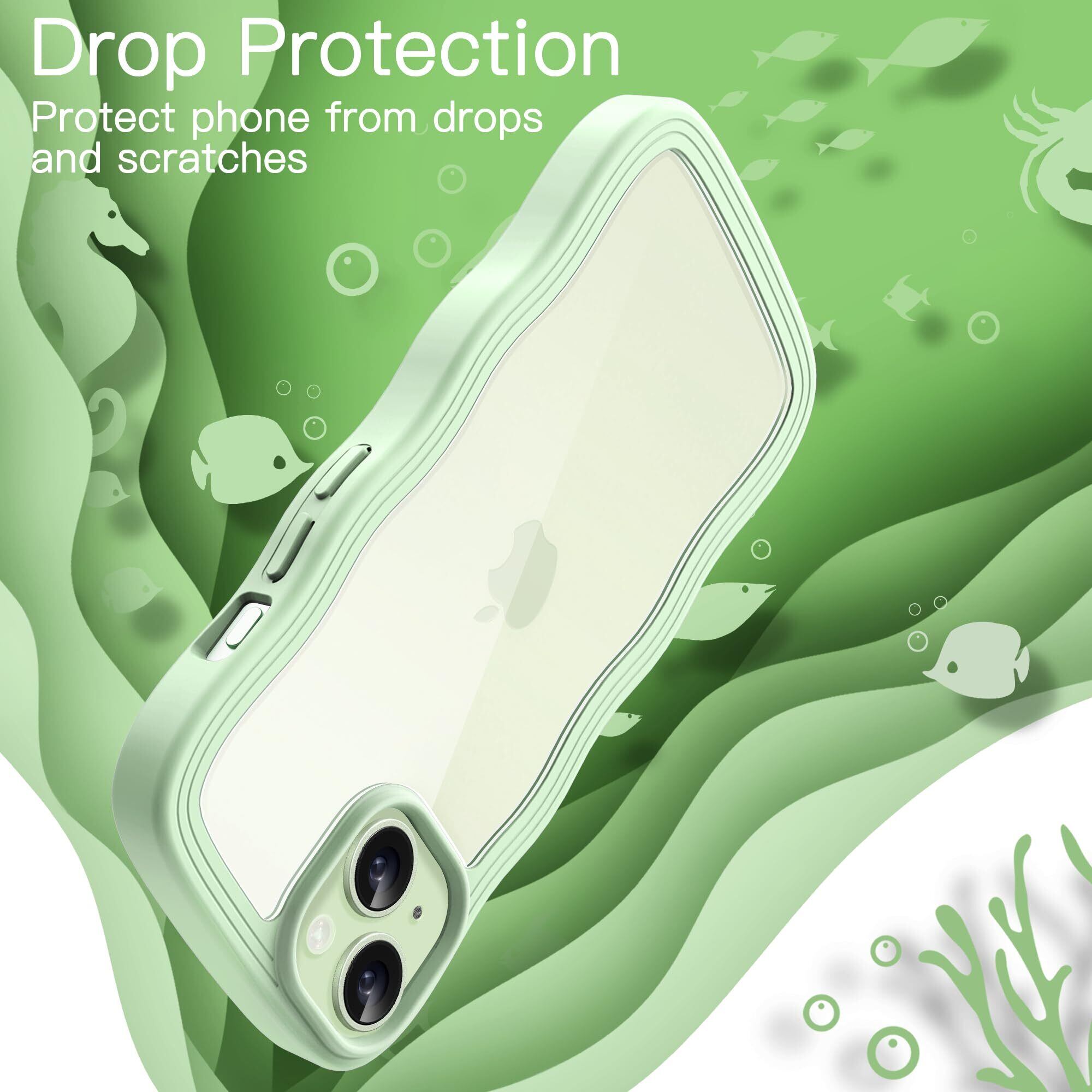JEDirect iPhone 15 6.1インチ用 かわいい ケース 波状フレーム うねうね 耐衝撃 スマホカバー 女性用 女子向け クリア ハードPCバック (グリーン)
