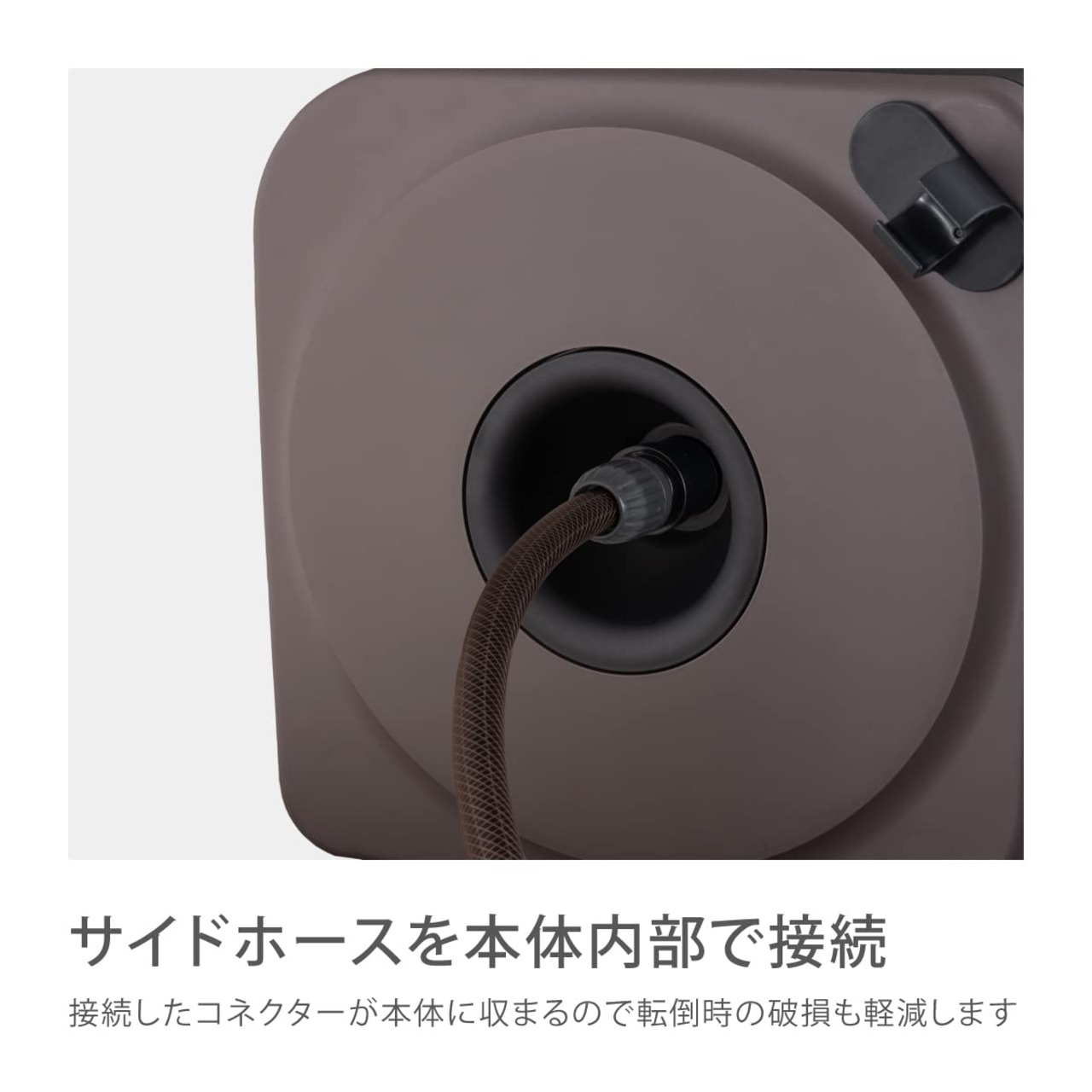 日差しからホースを守るフルカバーのホースリールです。 ホースガイド付きでホースが軽く引き出せます。 ねじれに強いツイスターホースを使用しています。 蛇口への接続は工具不要で蛇口にはめてダイヤルを回すだけのワンタッチ接続です。 取付けられる蛇口は横水栓(蛇口径14-18mm)、万能ホーム水栓です。