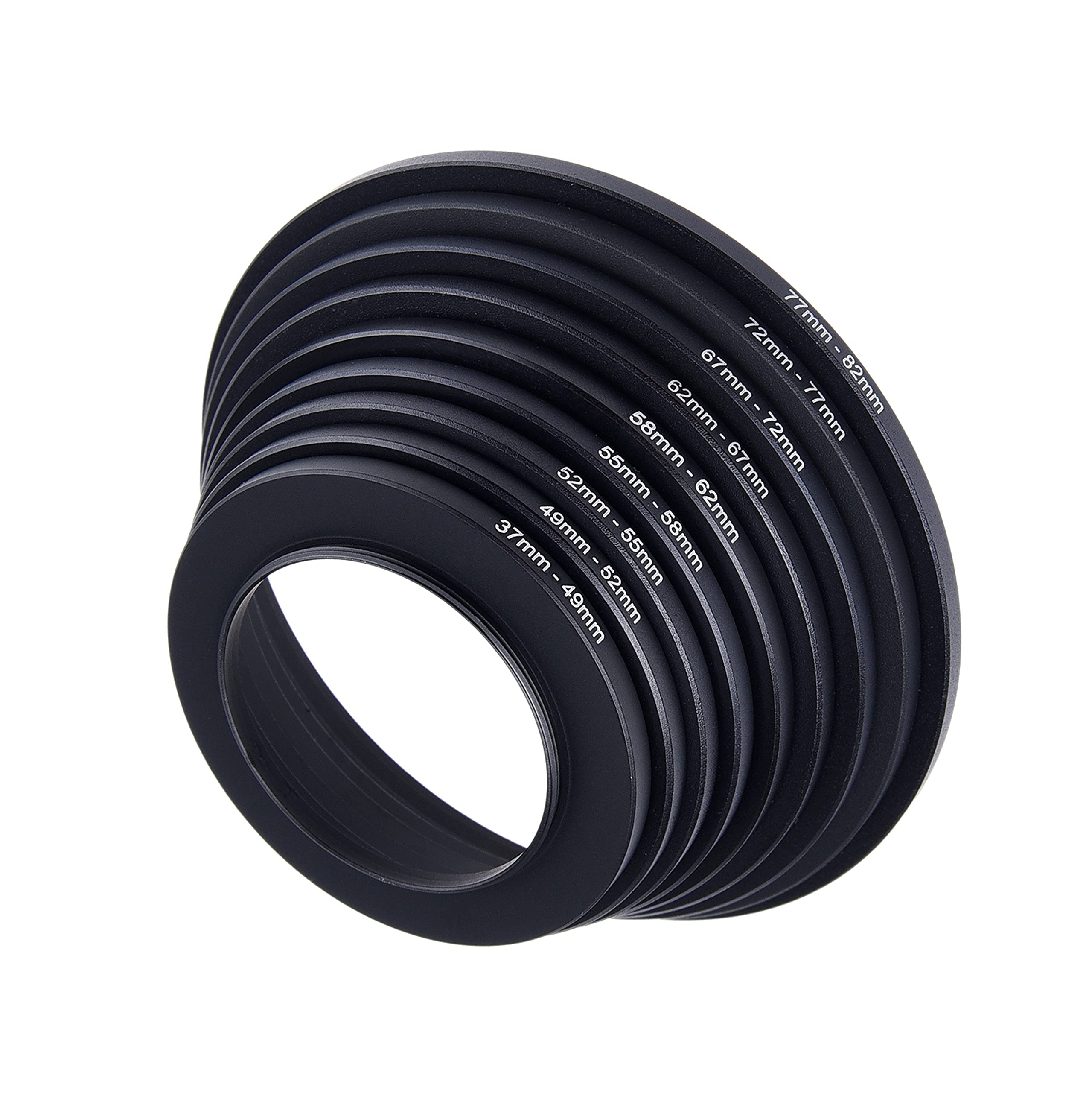 最大9サイズ (37mm~82mm) までステップアップ。このパッケージに含まれるアダプターリングは、37~49mm、49~52mm、52~55mm、55~58mm、58~62mm、62~67mm、67~72mm、72~77mm、および77~82mmです。