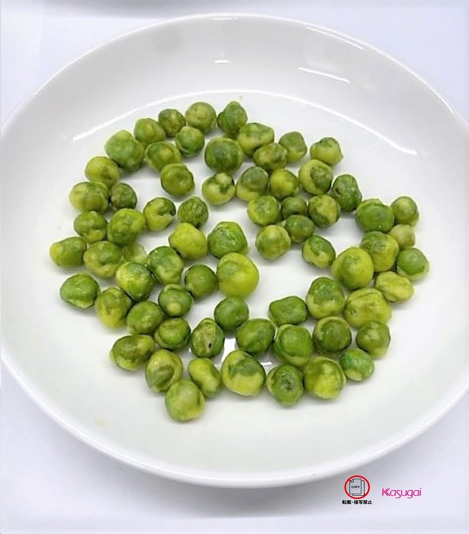 原材料:えんどう豆(輸入)、でん粉、食用油脂、砂糖、小麦粉、水あめ、食塩、ぶどう糖、配合調味料、わさび葉パウダー/香料、調味料(アミノ酸等)、膨脹剤、環状オリゴ糖、乳化剤、着色料(黄4、青1)、(一部に小麦・大豆を含む)