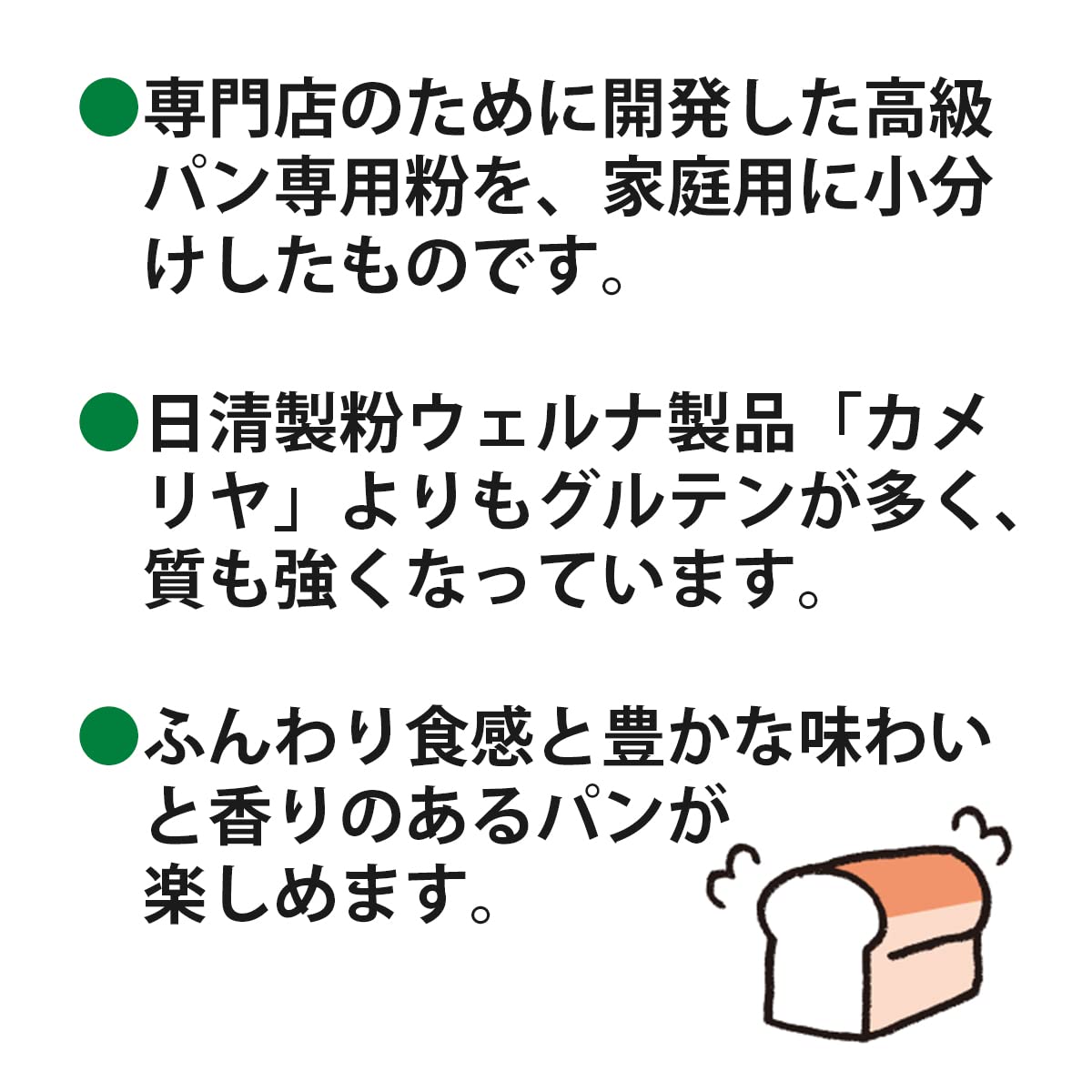 こだわって本格的にパン作りをしたいという皆様にご満足頂く為に、専門店のために開発した高級パン専用小麦粉を小分け包装したものです。厳選した小麦を使い独自の製粉技術で作りあげた高たん白の特選強力粉なのでボリュームがありソフトでふんわりとしていて豊かな旨味と香りあるパンをお楽しみいただけます。