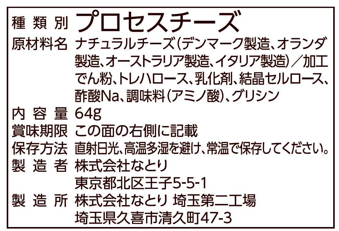 原材料:ナチュラルチーズ(デンマーク製造、オランダ製造、オーストラリア製造、イタリア製造)/加工でん粉、トレハロース、乳化剤、結晶セルロース、酢酸Na、調味料(アミノ酸)、グリシン