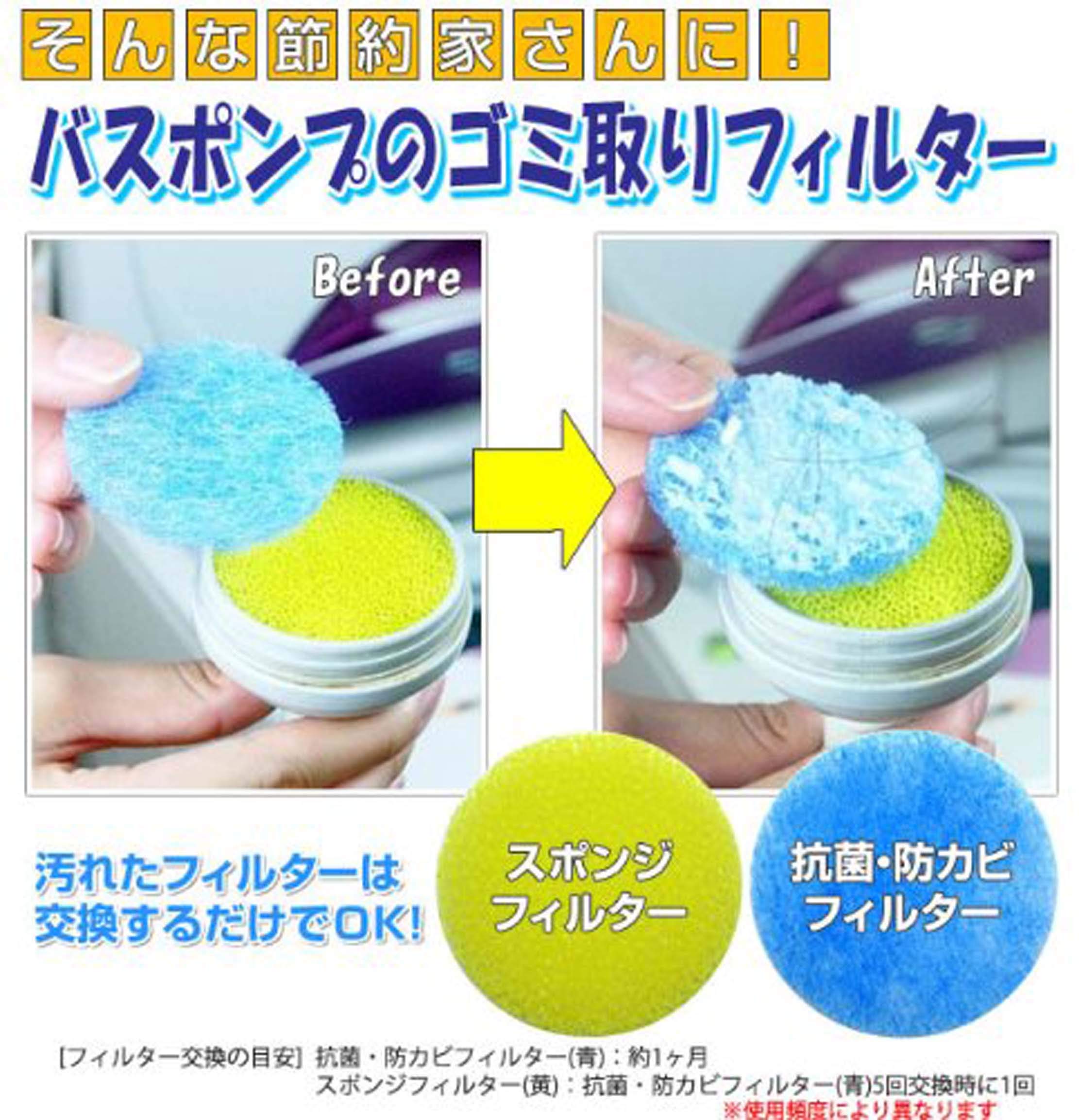 バスポンプの替えフィルターです。お風呂の残り湯内のゴミ・髪の毛などが洗濯機に進入するのを防ぐ!バスポンプの汚れ・詰まりが取替えるだけで解消!さらに抗菌・防カビ配合素材で安心です。