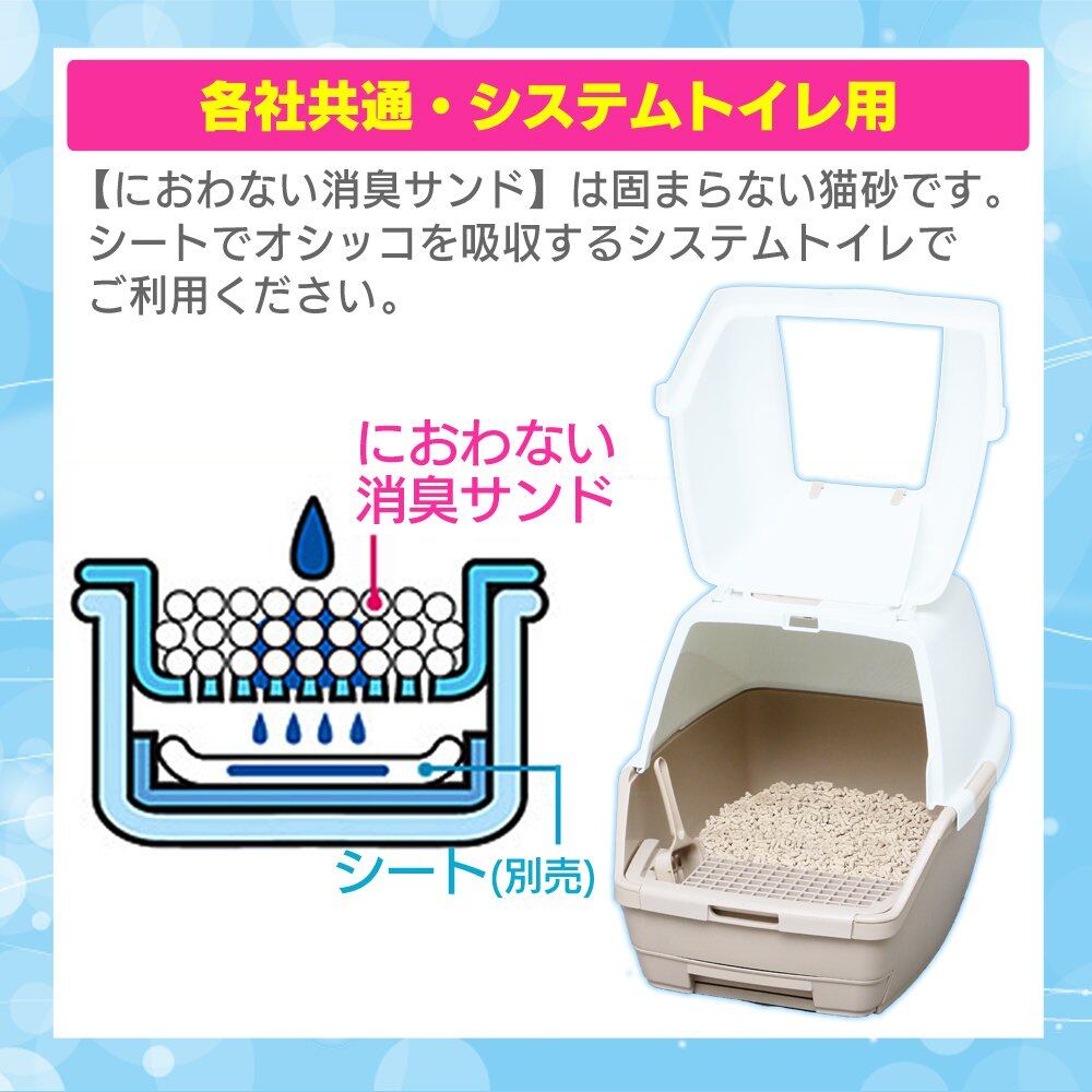 【におわない消臭サンド】:システム猫トイレ専用、固まらない猫砂。 クエン酸の力でアンモニアを中和し、長時間がっちり消臭。