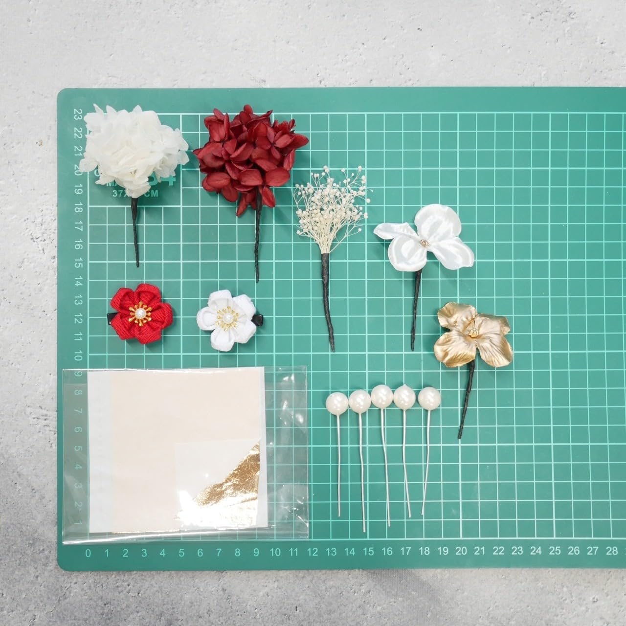 ︎パーツ詳細︎つまみ細工2パーツ、ドライフラワー 3パーツ、アートフラワー(造花) 2パーツ、パールピック、ブロンズ箔