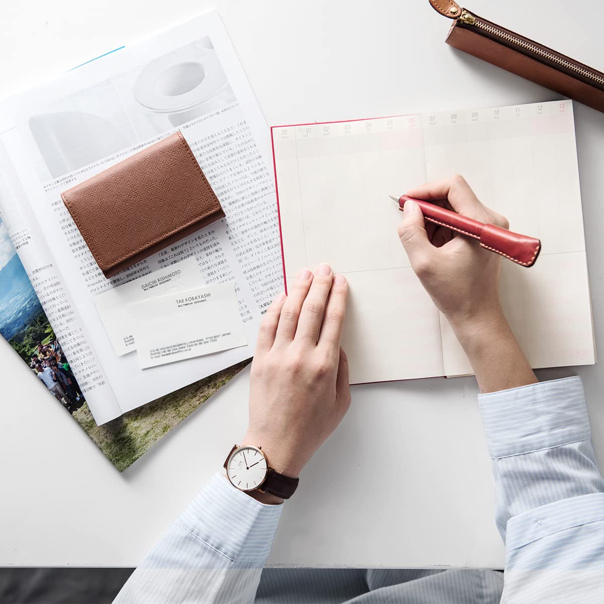 上品なプリズム型押しレザーを特注しました。 きちんとしたビジネスの場にも馴染み、初対面の相手にも好印象を与えてくれます。