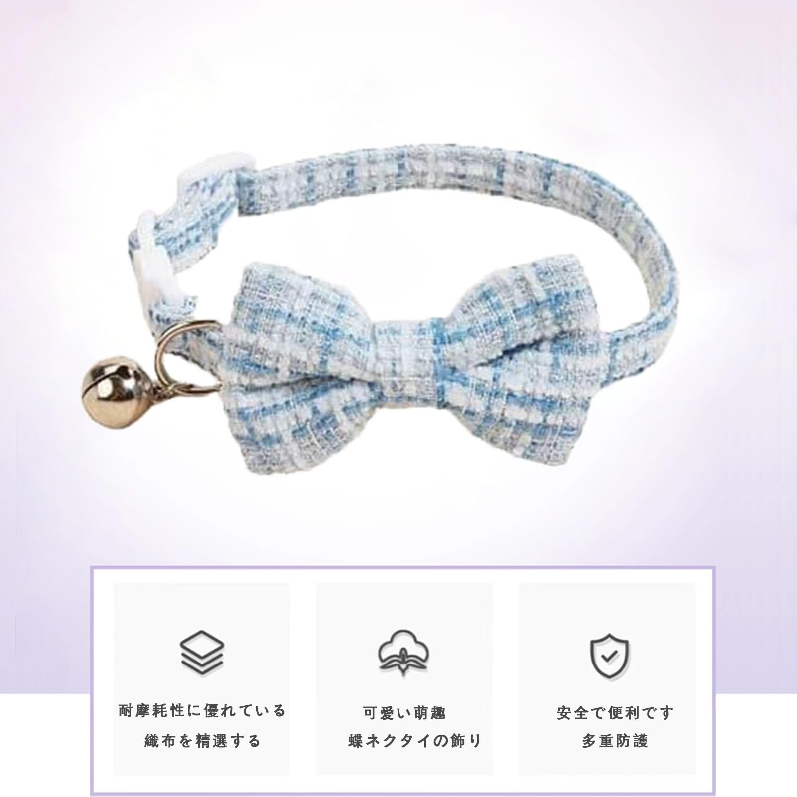 【素材】:首輪はチェック柄のデザインでオシャレで可愛いです。素材は耐久性のある布生地で柔らかくとても軽いから、猫ちゃんのお肌にはとっても優しいです。手洗いでもokです。