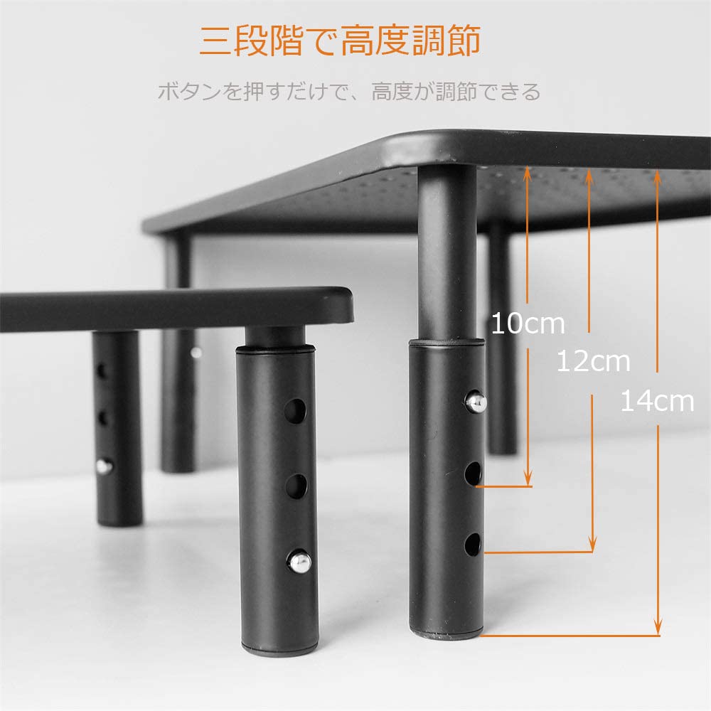 【丈夫で安定性抜群】頑丈なスチール製で、しっかり物を支えます。脚の下部にはゴムパッドがあるので、滑り止めることができて、傷を防止することもできます。20kgまでのノートパソコンとモニターを載せることができます。