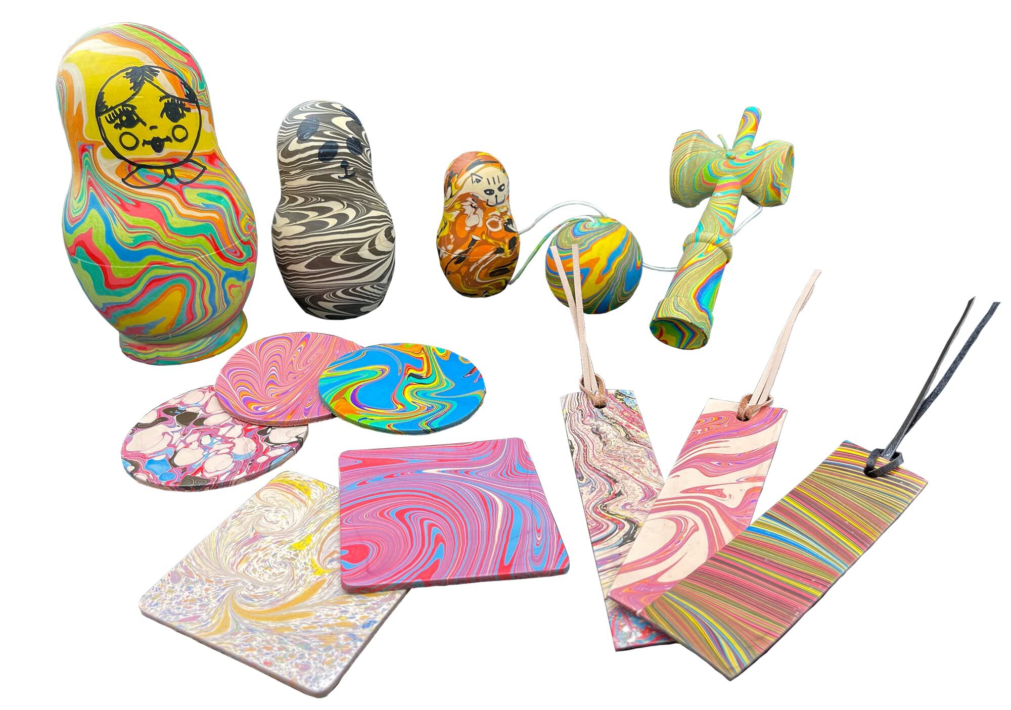 道具選びから扱いまで、高い技術を要求されるマーブリング。そんなマーブリングを、誰でも驚くほど簡単に楽しめるようにした、画期的なセットが「マーブリング・デコ」シリーズです。素材も選ばず色々なものにマーブリングで出来るし、材料の全てが水性なので、後片付けも水と一緒に流すだけ。最初から最後まで本当に簡単に、本格的なアートを楽しめます。別売りのマーブリング・デコ水溶液と水を1:1で混ぜた水溶液の上に絵具を垂らします。色を重ねたら竹串で模様をつくり、お好みの素材(吸水するもの)を水面に当てるとマーブリングができます。容量:各10ml 色:そら(ライトブルー)・むらさき(パープル)・だいだい(オレンジ)・きみどり(イエローグリーン)・もも(ピンク)・ちゃ(ブラウン) 色ラベルシール入り