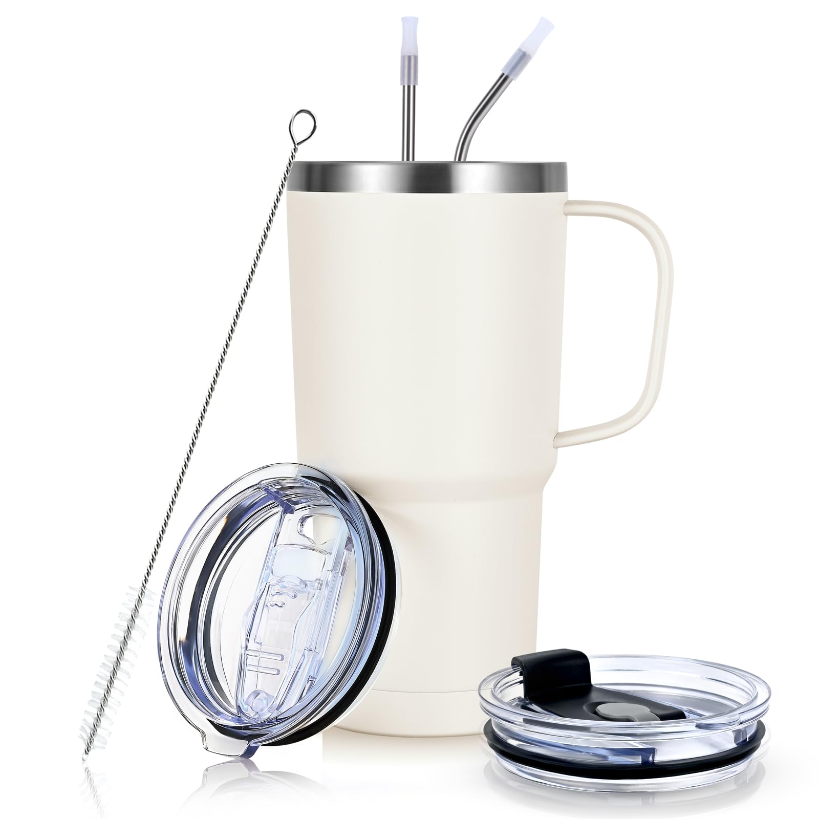 Livole 真空断熱 マグカップ タンブラー 取っ手付き 保温 保冷 600ml 大容量 蓋付き コーヒーカップ マグボトル 携帯マグ カップ 大きめ ステンレス 二重構造 魔法瓶 ストロー付き コーヒー お茶 ビール ジュース 炭酸飲料 ビア オフィス アウトドア 釣り 遠足 登山 キャンプ ベージュ
