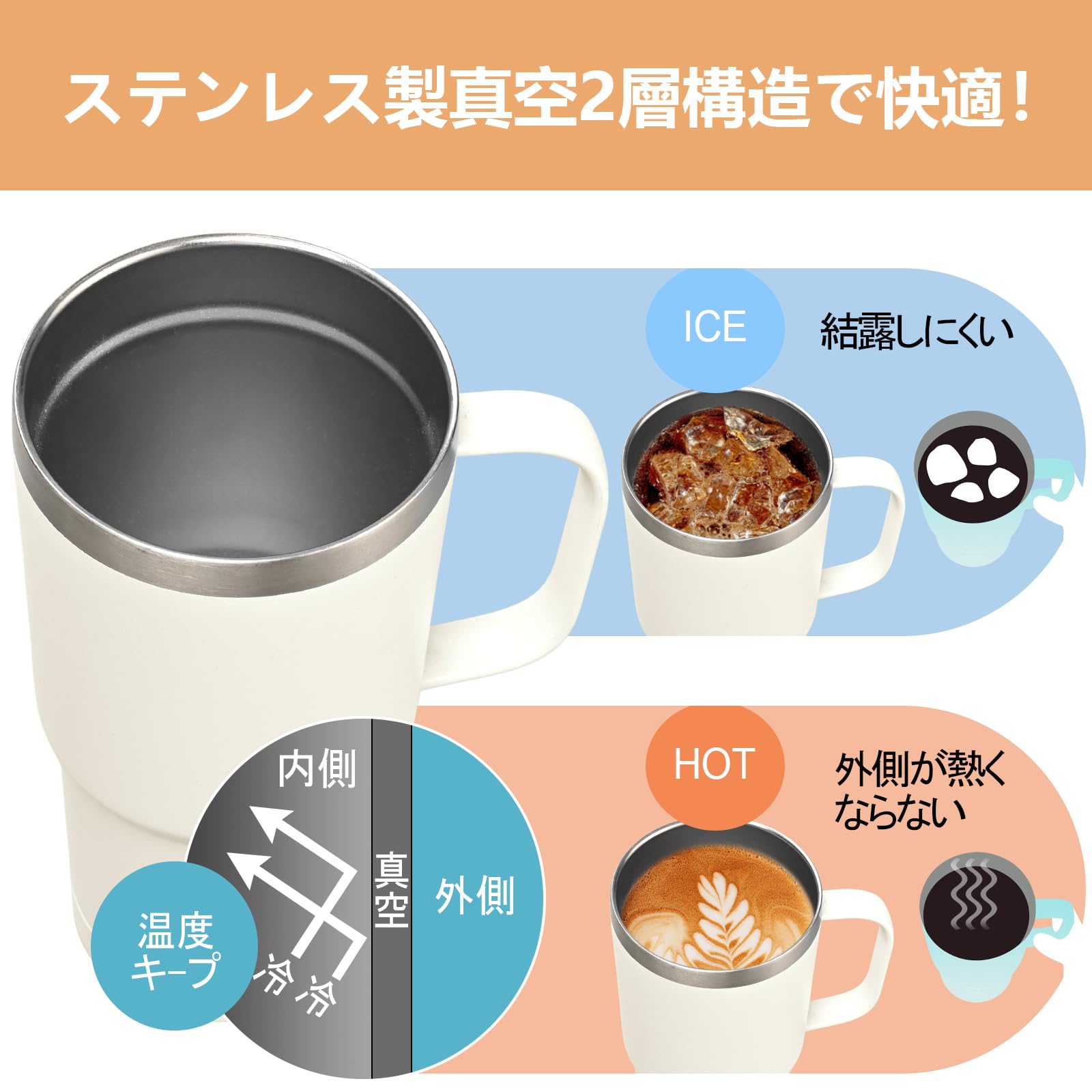 【真空2重構造で冷たさ・温かさ長持ち】取っ手付きタンブラーの外側と内側の間の空洞部分は真空構造で、飲み頃温度をキープします。飲み物からアイスまで、幅広く使える真空断熱カップ。また結露しにくく、机を汚さない、コースターいらず。熱い飲み物を入れても外側が熱くならない。