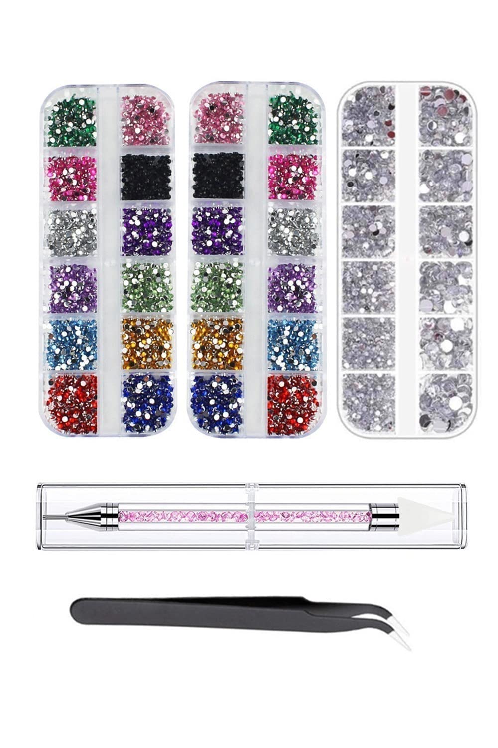 YFFSFDC カラーラインストーン ネイルアートパーツ 大容量 12色 アクリルラインストーン 3個ケース入り ネイル デコ用 DIY 服装使用 ピンセット付きとポイントドリルペン付き