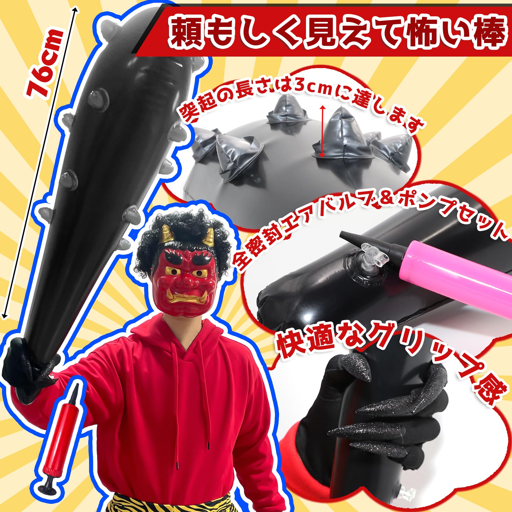 節分・豆まきにぴったり:郷土色豊かで味わい深い手作りの鬼のお面に、手にはコントラストの効いたこん棒に色彩豊かな虎柄の鬼パンツを纏えば、“節分オニ退治豆まき用コスチューム”の完成です。節分やパーティの鬼の仮装には、欠かせないアイテムとして、膨らませるタイプの鬼のこん棒があります。この大迫力のこん棒は、上部には本格的なとげとげが装備されています。空気を入れて膨らます仕組みなので、鬼のコスプレとの相性が抜群です。節分やパーティでの鬼の仮装をより一層楽しく演出するために、ぜひご活用ください。
