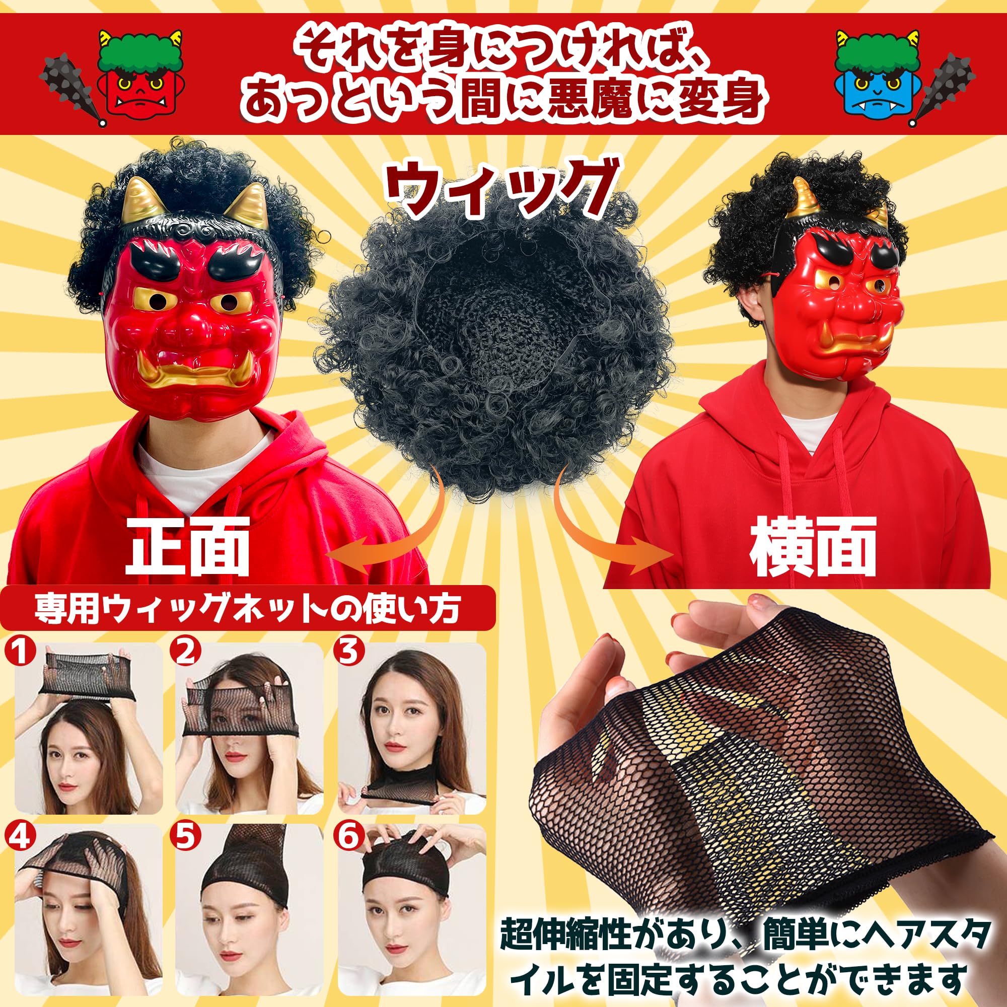 イベントで大人気:鬼は外、福は内。「魔(ま)を滅(め)っする」 無病息災の願いをこめて豆(まめ)を撒く節分には欠かせない、なりきりタイプコスチューム 鬼おに節分オニ退治赤鬼青鬼 豆まき用お面コスチュームセットです。