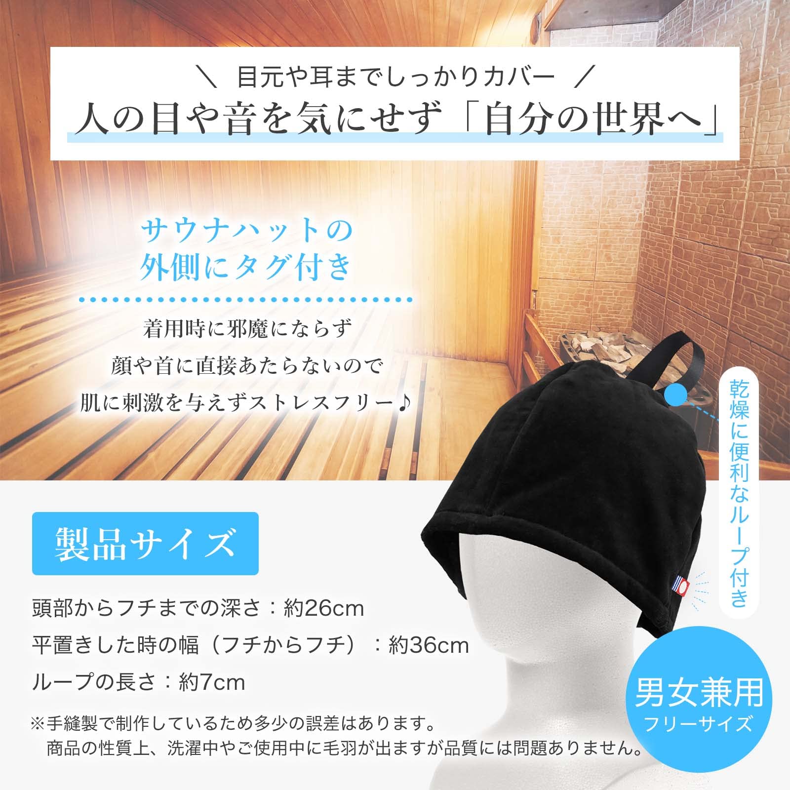 【サウナハット効果】頭部を守ることで髪の乾燥防止(パサつきの軽減)や熱波から頭皮を守ります。頭部の温度上昇を防ぐことで、サウナの暑さが苦手な方でも、のぼせ防ぎ、長時間サウナを楽しむ事ができます。自社製品は大きめサイズで目元・耳元までしっかりカバーできます。視界や音を制限しサウナに集中できます。