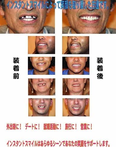 全米で大ヒット中! 歯並びや欠けが気になる方に朗報です。このインスタントスマイルを使えばスグに素敵な笑顔を取り戻す事ができます。脱着はワンタッチで行えますのでいつでもどこでも気軽に使用出来ます。本体をお湯で柔らかくしてご自身の前歯のカーブに合わせてフィッティング後、冷え固めます。次に付属のフィッティングビーズ(軟質樹脂製の取付け用具材)をお湯で粘土状にしてティース本体に取り付けてご自身の歯にあてがって型取りします。ゆっくりと外して冷え固まればご使用開始となります。フィッティングはリセット可能ですのでやり直し出来ます。面接に、デートに、旅行に! インスタントスマイルはあなたに自信と笑顔を提供いたします。安全検査に合格済みの製品です。こちらは女性、顎の小さめの男性向きです。※八重歯や前歯が大きく傾斜している場合、適合が難しい場合があります。