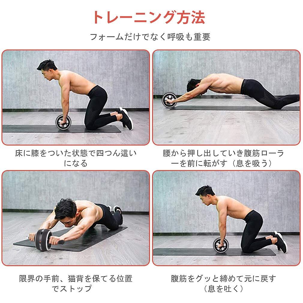 使い方:①床に膝をついた状態で四つん這いになる;②腰から押し出していき腹筋ローラーを前に転がす;このとき背中は猫背のように少し丸めて、手首を返さないで丸めるように意識することがコツとなります;③限界の手前、猫背を保てる位置でストップ;限界まで伸ばしてしまうと腰を痛める可能性があります。そのため、猫背を少し保てる位置でストップしょう;④腹筋をグッと締めて元に戻す;元に戻すときは、腕で引っ張らないことがコツです;しっかりと腹筋に力を入れて元の状態へ戻しましょう;この時、おへそを見るように意識することで腰が中に入らないようにすることがポイント;これが正しいやり方;床やフローリングで転がすことができてそれらに傷つくことはありません