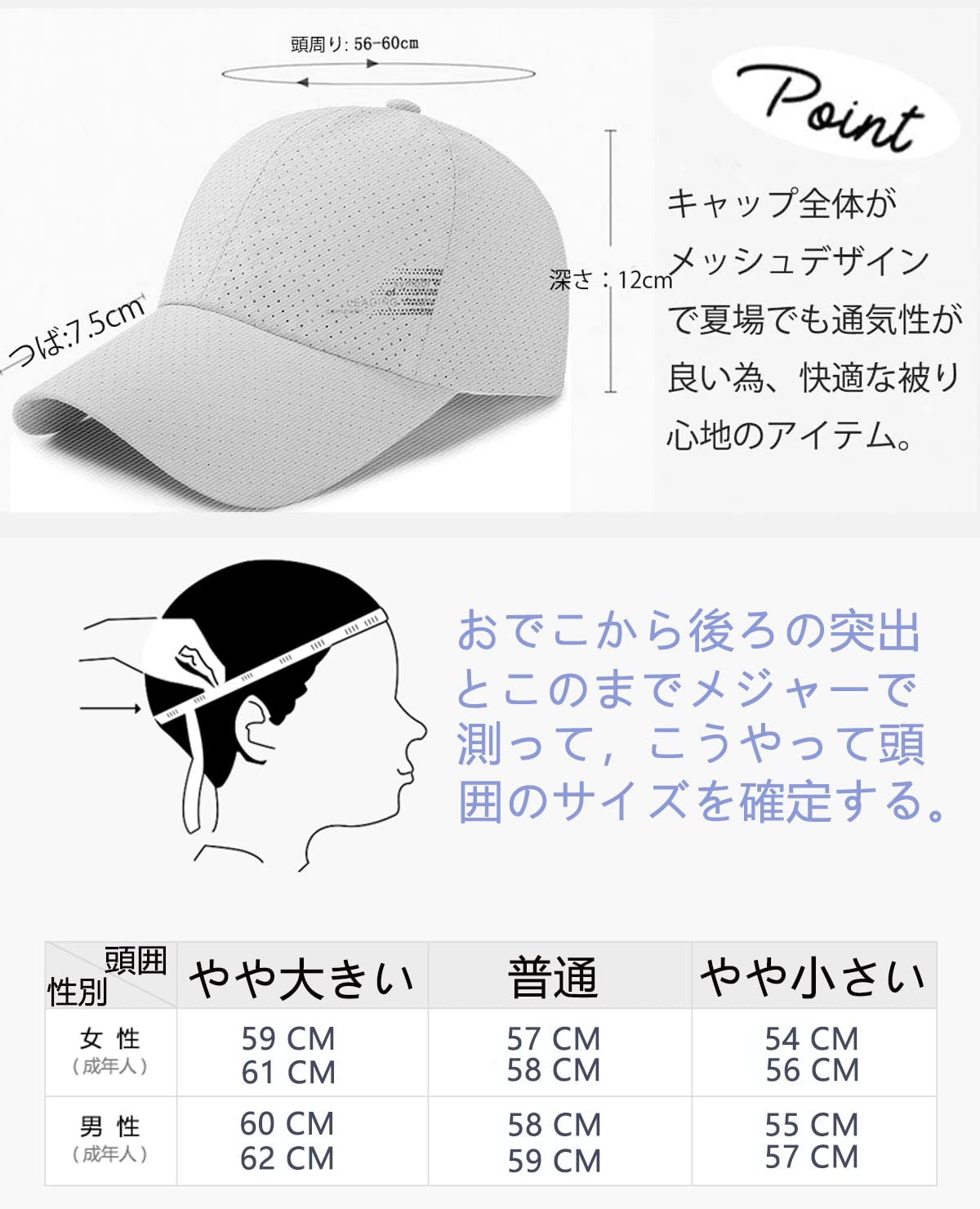 【調整可能】帽子後のアジャスターでサイズ調整で簡単ぴったりフィット!頭周りを大きくすると、小さくなるかもしれませんよ。深さ約:12cm、つば約:7.5cm、頭周り約56-60cm。重さ約50g男女兼用のフリーサイズ。