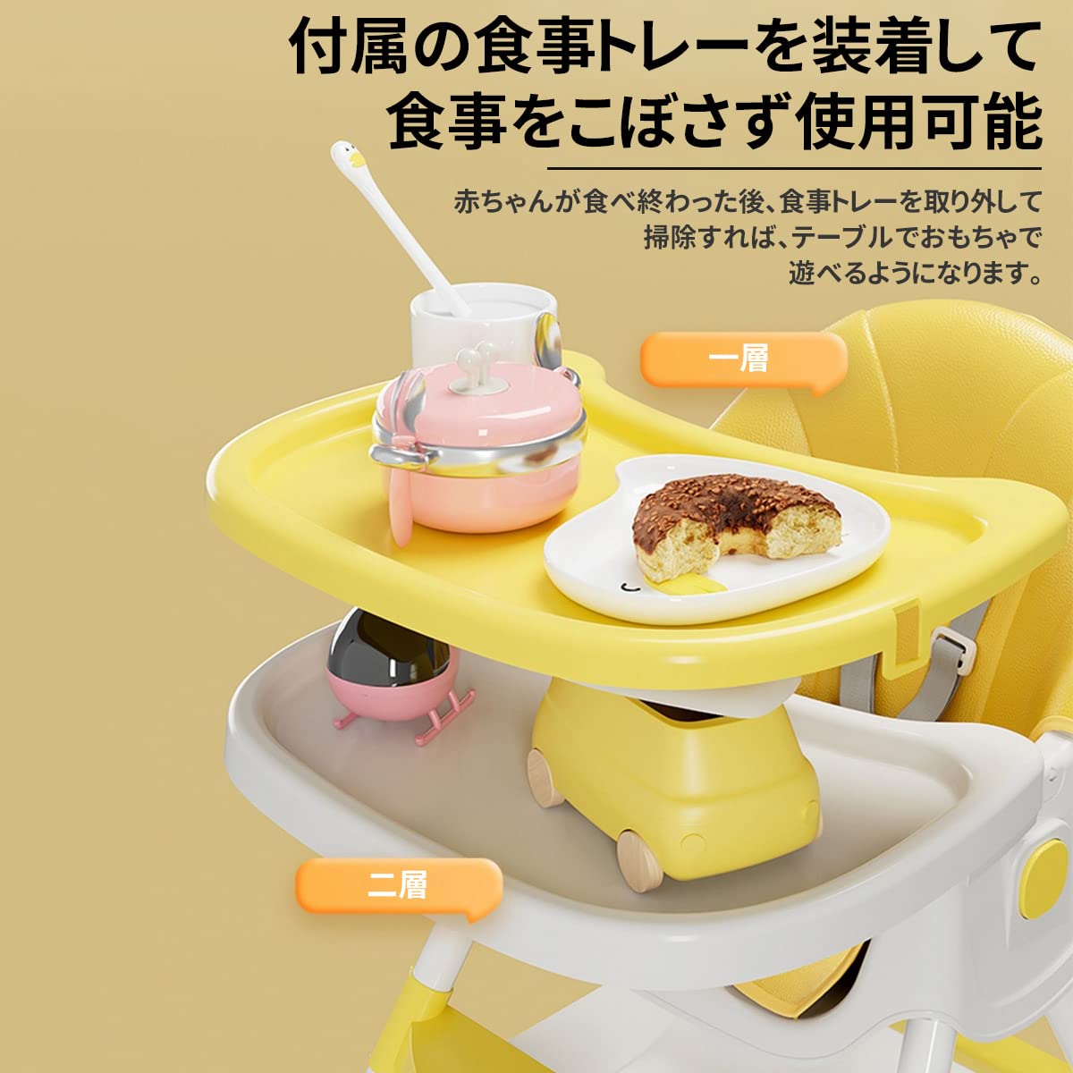 【5点式保護ベルト・収納かご付き】お子さまの落下を防ぐ安全ベルト付きで、離乳食を始めたばかりの月齢の低いお子さまでも安心してお使いいただけます。収納かごが付属していて、オムツ、哺乳瓶やおもちゃんなどをそれぞれ入れ安くて、空間を十分に利用できます。