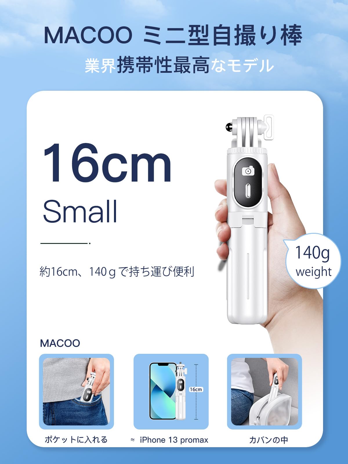 【軽量、ポケットサイズ】MACOOは自撮り棒を使用するシーンを考えて、数え切れないほどの実験の経て、自撮り棒の機能が満たされている状態で更に小型に進化しました。自撮り棒は71cmまで伸縮可能、折り畳んだ状態は16㎝、500mlのペットボトルよりも小さい、薄さは半分ぐらい、ズボンのケットにも入ります。じどり棒の重量は約140g、市販商品と比べると35%軽量化して、持ち運びは非常に便利です!