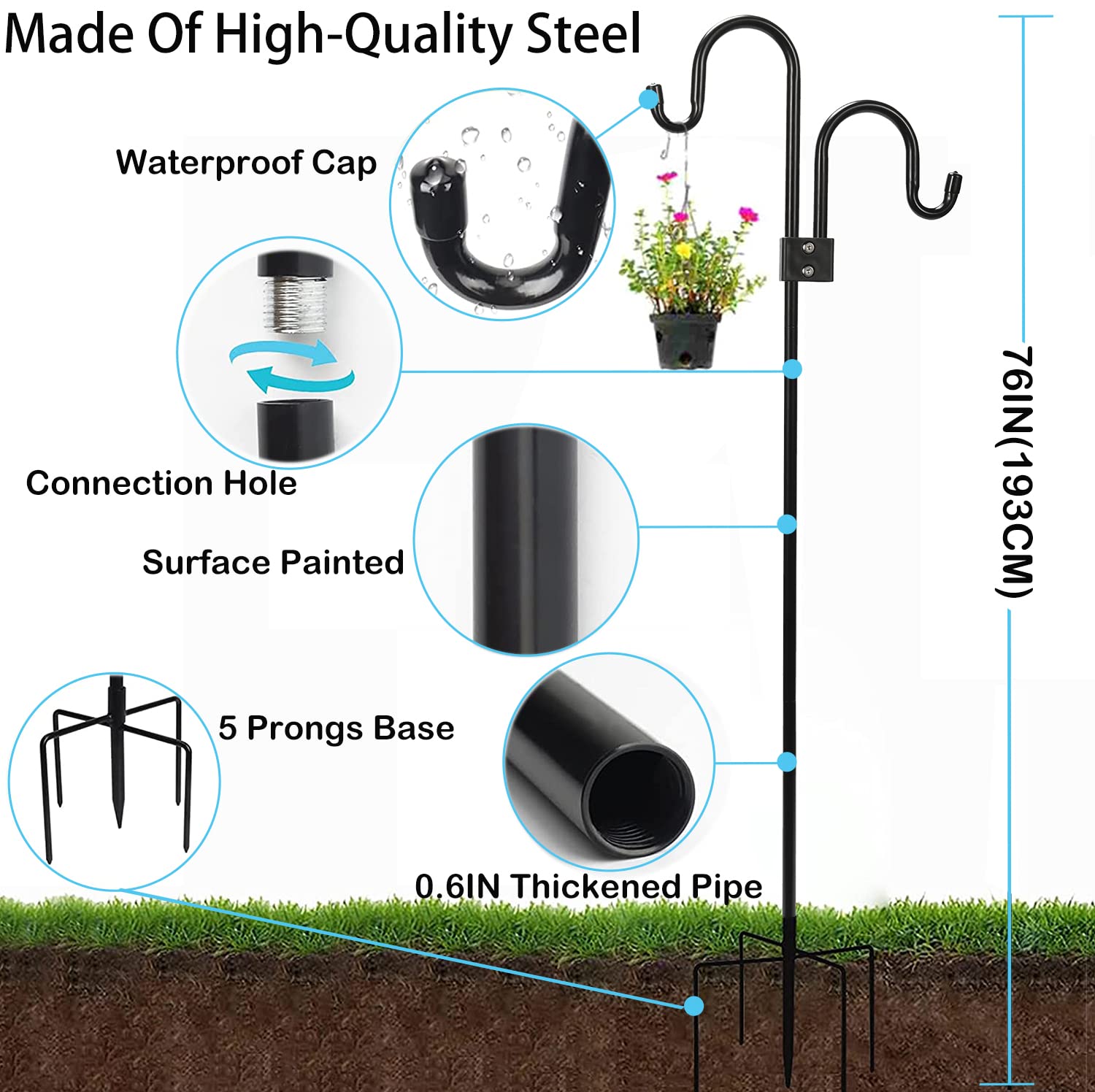 幅広い用途:これらのランタンポールは、フラワーバスケット、プランター、バードハウス、バグキャッチャー、ソーラーライト、メイソンジャー、ランタン、金属スピナー、キャンドルホルダー、ストリングライト、風のチャイム、モスキートトラップ、射撃ターゲット、レモングラスキャンドルに垂れ下がっています。その他の追加の装飾。