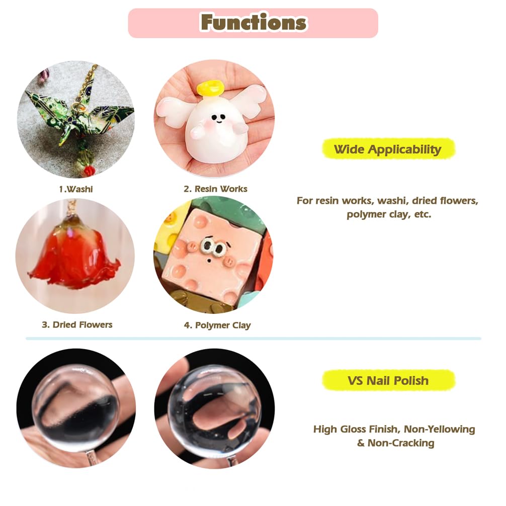 レジンワークはもちろん、ジュエリー、木材、紙、粘土、ガラス、ドライフラワーのコーティングにも適用です。さらに、失敗の修正にも使え、作品の表面に付いた傷もきれいに直せます!