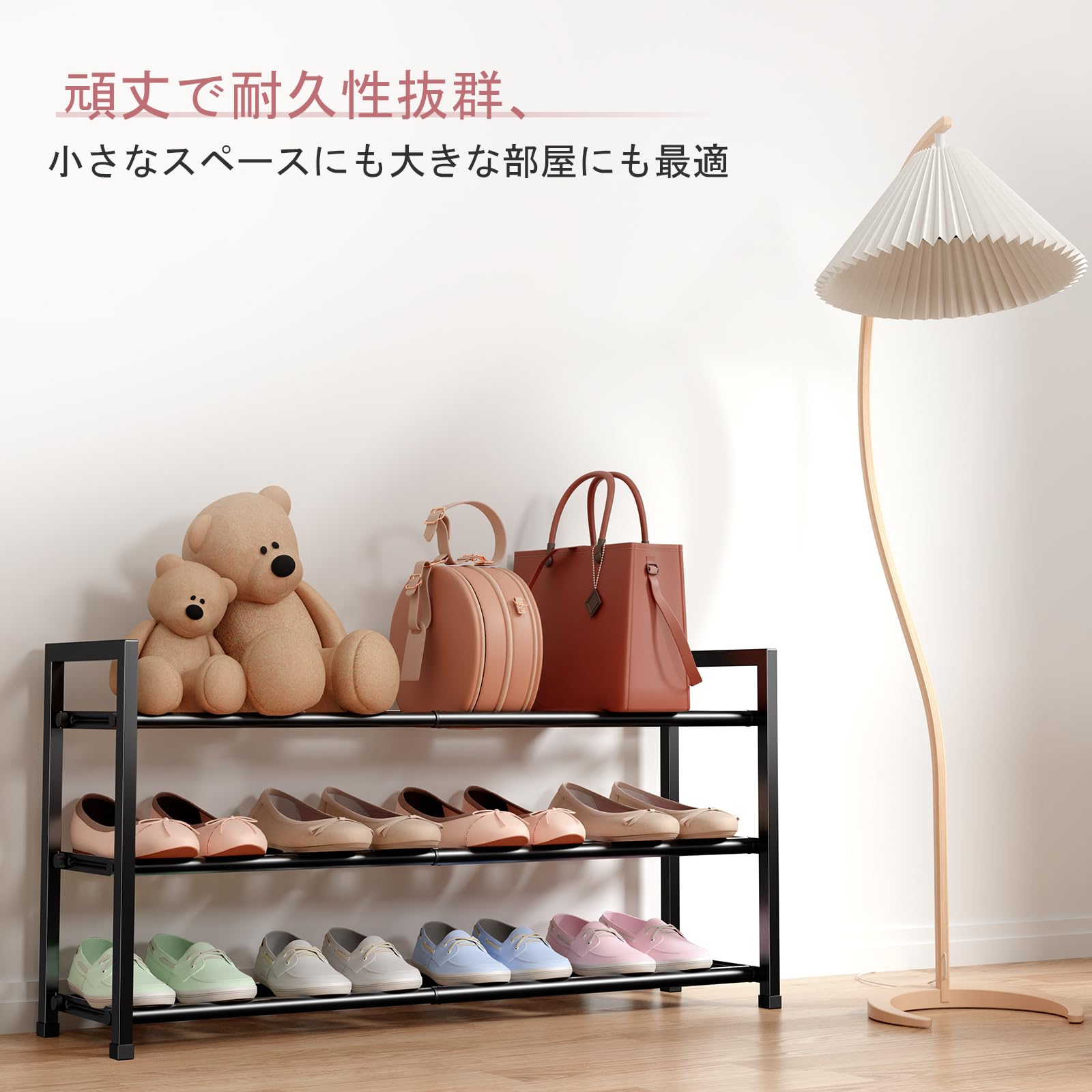 3段 伸縮式 シューズラック スリム 靴箱 スリム 省スペース 靴 収納 下駄箱 段ボールストッカー 玄関 廊下 鉄パイプ45cmから83cm伸縮 組み立て式(ブラック)