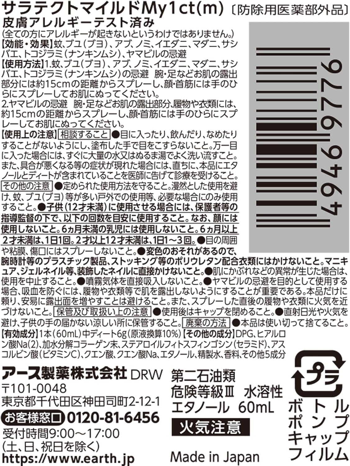●朝使って夜まで、1日しっかりガード ●独自の虫よけロングキープ処方 ●お肌にやさしい4種のうるおい成分配合(ヒアルロン酸Na、コラーゲン、セラミド、ビタミンC) ●皮膚アレルギーテスト済み(全ての方にアレルギーが起きないというわけではありません。) ●有効成分10% ●マリンの香り ●外出先の持ち運びに便利な、コンパクトサイズ ●機内持ち込みOK(持ち込み方法については、各航空会社にお問い合わせください。) 【効能・効果】蚊、ブユ(ブヨ)、アブ、ノミ、イエダニ、マダニ、サシバエ、トコジラミ(ナンキンムシ)、ヤマビルの忌避 【防除用医薬部外品】 【販売名】サラテクトマイルドMy1ct(m) ●トコジラミはピレスロイドに抵抗性をもつ個体もいるため、基本的には「ゼロノナイトGゴキブリ用・トコジラミ用 くん煙剤6~8畳」をご使用ください。 使用上の注意 【蚊、ブユ(ブヨ)、アブ、ノミ、イエダニ、マダニ、サシバエ、トコジラミ(ナンキンムシ)の忌避】 腕・足などお肌の露出部分には約15cmの距離からスプレーし、顔・首筋には手のひらにスプレーしてお肌にぬってください。 【ヤマビルの忌避】 腕・足などお肌の露出部分、履物や衣類には、約15cmの距離からスプレーし、顔・首筋には手のひらにスプレーしてお肌にぬってください。 原材料・成分 【有効成分】1本(60mL)中ディート6g 【その他の成分】BG、ヒアルロン酸Na(2)、加水分解コラーゲン末、N-ステアロイルフィトスフィンゴシン(セラミド)、アスコルビン酸(ビタミンC)、クエン酸、クエン酸Na、エタノール、精製水、香料 使用方法 【蚊、ブユ(ブヨ)、アブ、ノミ、イエダニ、マダニ、サシバエ、トコジラミ(ナンキンムシ)の忌避】 腕・足などお肌の露出部分には約15cmの距離からスプレーし、顔・首筋には手のひらにスプレーしてお肌にぬってください。 【ヤマビルの忌避】 腕・足などお肌の露出部分、履物や衣類には、約15cmの距離からスプレーし、顔・首筋には手のひらにスプレーしてお肌にぬってください。 安全警告 【相談すること】 ●目に入ったり、飲んだり、なめたりすることがないようにし、塗布した手で目をこすらないこと。万一目に入った場合には、すぐに大量の水又はぬるま湯でよく洗い流すこと。また、具合が悪くなる等の症状が現れた場合には、直ちに、本品にエタノールとディートが含まれていることを医師に告げて診療を受けること。 【その他の注意】 ●定められた使用方法を守ること。漫然とした使用を避け、蚊、ブユ(ブヨ)等が多い戸外での使用等、必要な場合にのみ使用すること。 ●子供(12才未満)に使用させる場合には、保護者等の指導監督の下で、以下の回数を目安に使用すること。なお、顔には使用しないこと。6ヵ月未満の乳児には使用しないこと。6ヵ月以上2才未満は、1日1回。2才以上12才未満は、1日1回から3回。 ●目の周囲や粘膜、傷口にはスプレーしないこと。 ●変色のおそれがあるので、腕時計等のプラスチック製品、ストッキング等のポリウレタン配合衣類にはかけないこと。マニキュア、ジェルネイル等、装飾したネイルに直接かけないこと。 ●肌にかぶれなどの異常が生じた場合は、使用を中止すること。 ●噴霧気体を直接吸入しないこと。 ●ヤマビルの忌避を目的として使用する場合、吸血を防ぐには、履物や衣類等で肌を露出しないようにすることが重要である。本品だけに頼り、安易に露出面を増やすことは避けること。また、スプレーした直後の履物や衣類に火気を近づけないこと。
