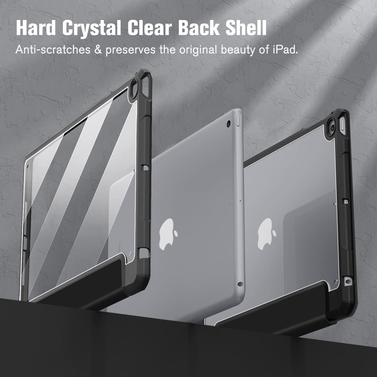 【材料・透明バックカバー】 ケースの表面はPUレザー素材を利用して、軽量、超薄を備えます。ポリカーボネート素材を採用している透明バックカバーは汚れや傷つけなどを防止するだけでなく、iPad本体の色と美しさも活かせます。透明バックカバーの枠は柔軟なTPUを採用して、取り付けも簡単にできます。フロントカバー内部材質はマイクロファイバーで、摩擦によって発生する傷を抑え、液晶画面を保護しきれいに保ちます。(ご注意:透明バックカバーには保護用のフィルムがついていますので、ご使用前に保護フィルムを剥がしてください。)