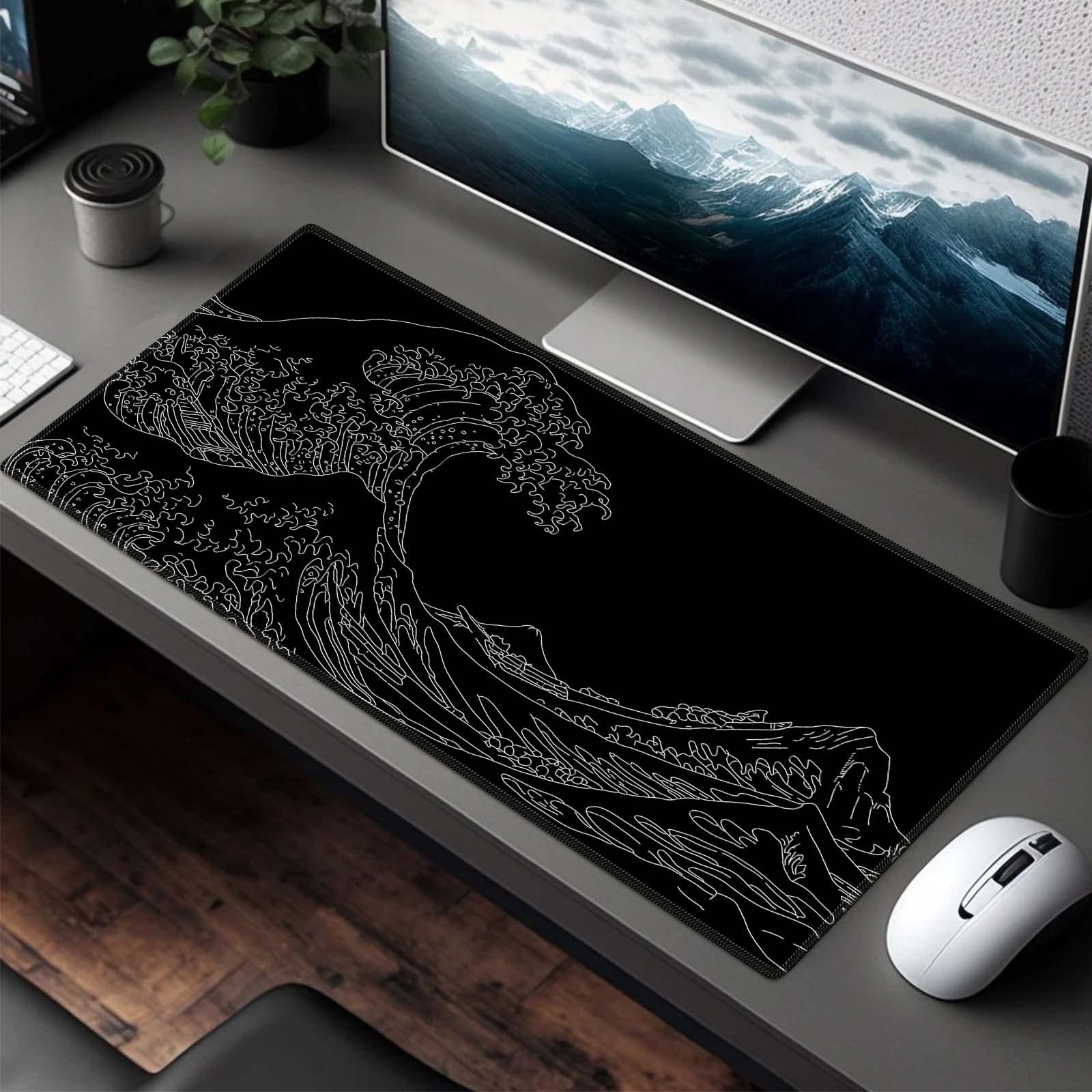 iCasso マウスパッド ゲーミング 大型 デスクマット90x40cm 耐水性 清潔しやすい 滑り止め ゴムベースデスクマット 仕事 ゲーム オフィス ホーム用(神奈川沖浪裏・ホワイトライン)