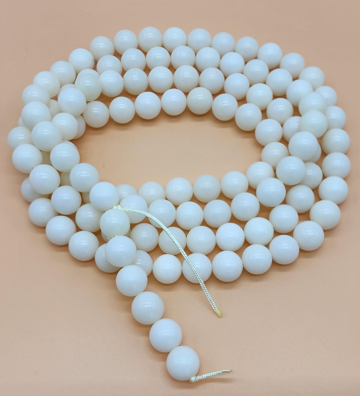 大きい白い珠で長い数珠なのでかなり目立ちます。