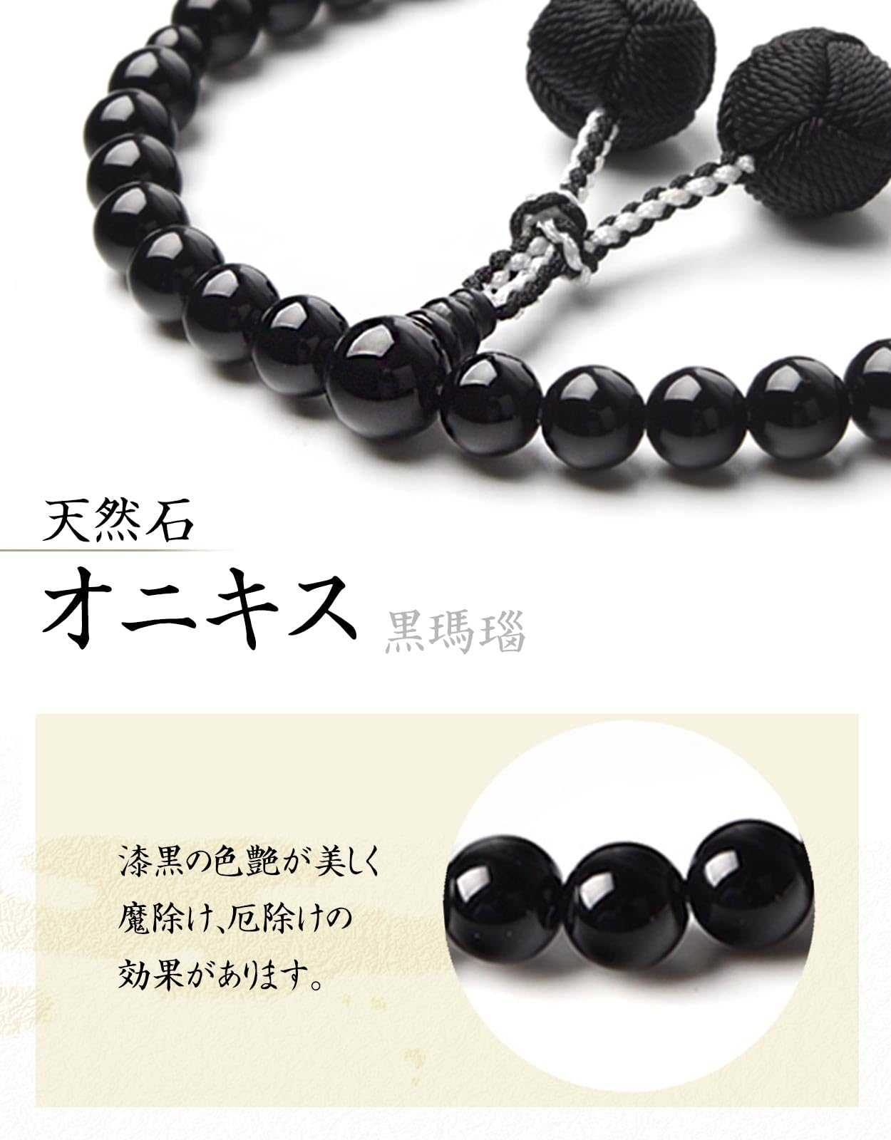 数珠の素材:オニキス…主珠:8mm玉、親珠:10mm玉、天珠:6mm玉、人絹梵天房