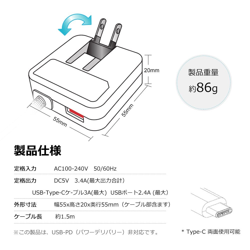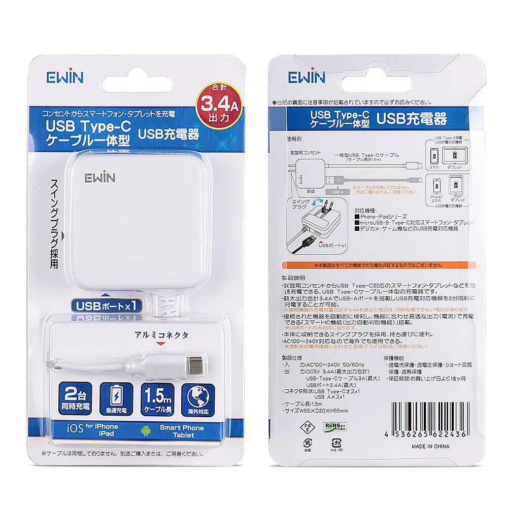 EWiN USB充電器 合計3.4A 急速充電 USB タイプc 急速充電器 Type-Cケーブル一体型 Smart IC搭載 ACアダプター 1.5mケーブル 折りたたみ式プラグ PSE認証済正規品 iPhone & Android & iOS &ゲーム機など対応