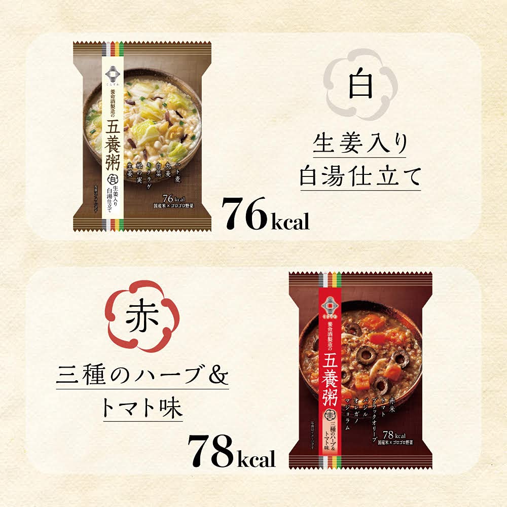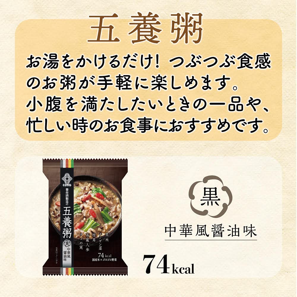 原材料:【黒】精白米(国産)、チンゲン菜、黒米(国産)、エキス(チキンエキス、ほたてエキス、酵母エキス)、しょうゆ、おろししょうが、クコの実、でん粉、食塩、ごま油、たん白加水分解物、乾椎茸、ごま、高麗人参、オイスターソース、トレハロース、酸化防止剤(V.E)、(原材料の一部に小麦、豚肉、魚醤(魚介類)を含む) 【赤】精白米(国産)、ソテーオニオン、ドライトマト、トマトペースト、玉ねぎ、オリーブ、赤米(国産)、マッシュルーム水煮、エキス(チキンエキス、野菜エキス、酵母エキス)、食塩、でん粉、たん白加水分解物、香辛料、酸化防止剤(V.E)、酸味料、(原材料の一部に小麦、乳成分、大豆を含む) 【緑】精白米(国産)、豆乳、ほうれん草、ピーマン、エキス(チキンエキス、野菜エキス、酵母エキス)、紅鮭、緑米(国産)、緑豆、ほうれん草ペースト、食塩、でん粉、たん白加水分解物、ガーリックパウダー、胡椒、トレハロース、酸化防止剤(V.E)、甘味料(ステビア)、(原材料の一部に乳成分、小麦、大豆を含む) 【黄】精白米(国産)、かぼちゃペースト、かぼちゃ、ピーマン、かぼちゃの種、もちきび、食塩、でん粉、鰹節エキスパウダー、酵母エキス、たん白加水分解物、パセリ、酸化防止剤(V.E)、(原材料の一部に豚肉を含む) 【白】精白米(国産)、白菜、鶏卵、ビーフエキスパウダー、はと麦、丸麦、しょうが、でん粉、松の実、たん白加水分解物、食塩、おろししょうが、酵母エキス、キクラゲ、乾燥ねぎ、ガーリックパウダー、オニオンパウダー、酸化防止剤(V.E)、(原材料の一部に乳成分、小麦、大豆、豚肉を含む)
