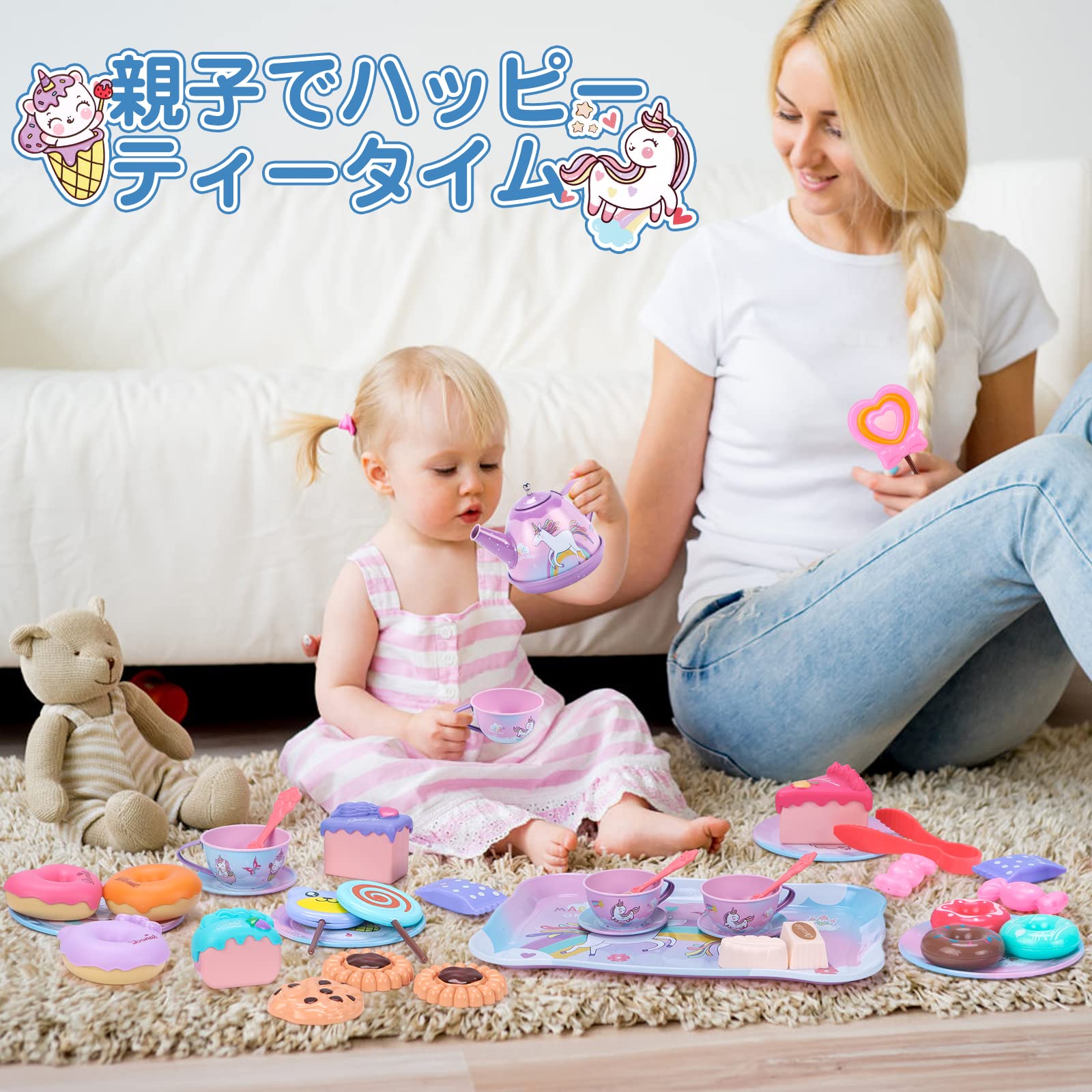 Qizebaby 赤ちゃんのおもちゃ 48PCS ユニコーン アフタヌーンティーのおもちゃ 屋内ゲーム お茶 ティーポット ティーセット ビスケット ケーキ デザート キャンディー デザートスタンド ままごと・ごっこ遊び 親子遊び 知育玩具 食べ物認知 誕生日 プレゼント お礼の品 女の子 クリスマス 進学祝い ギフト 男女通用
