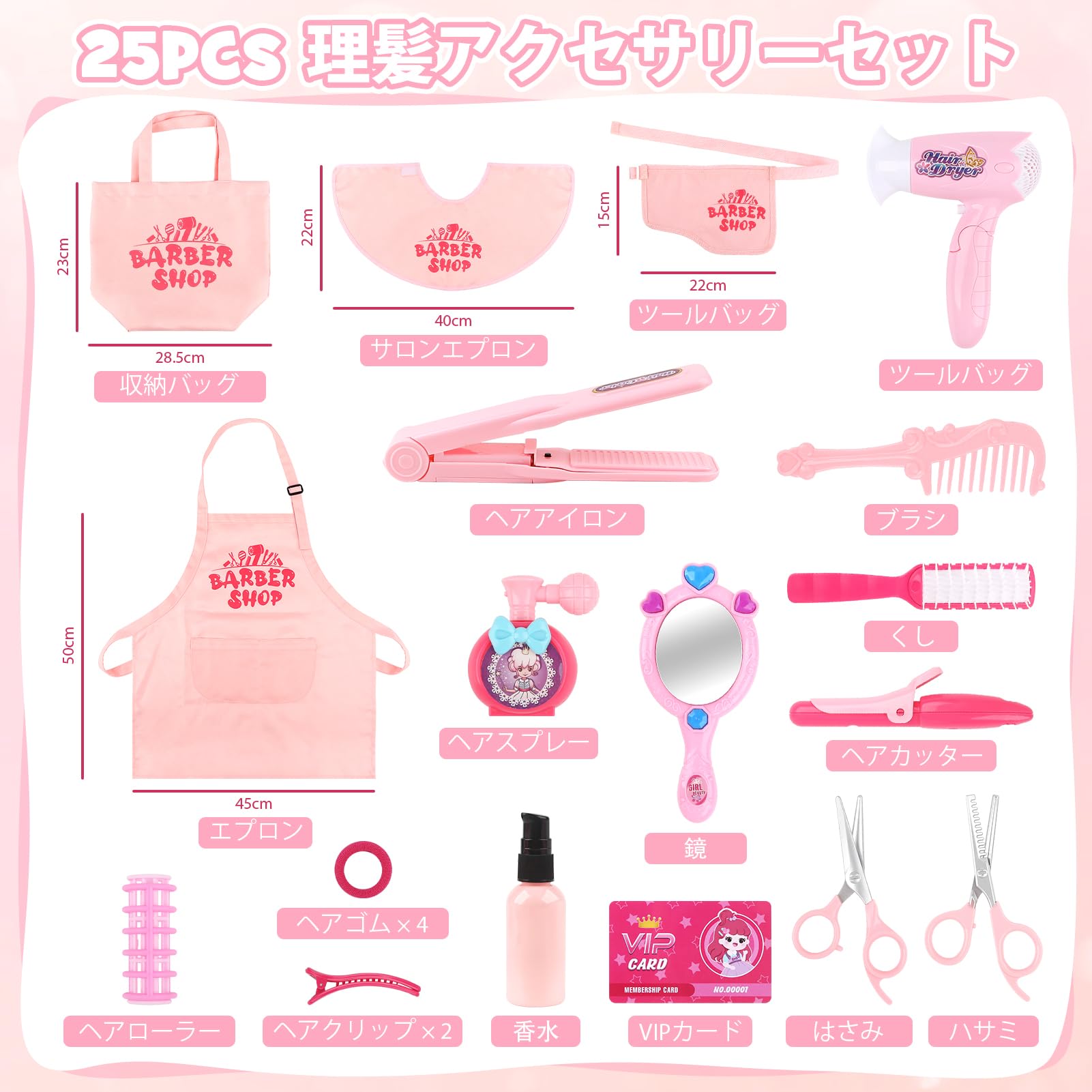 [メイクセット おもちゃ 女の子] この美容ヘアサロンおもちゃセットには、収納バッグ、ショール、ツールバッグ、スタイリストエプロン、ヘアドライヤー、ヘアストレートナー、ヘアカーラー、ハサミ、ハサミ、パドルヘアブラシ、コーム、ミラー、ヘアスプレー、ヘアローラー×4、ヘアタイ×4、ヘアクリップ×2、VIPカード、香水瓶など25点が含まれています。このごっこ遊びのヘアサロンおもちゃは、お子様が何時間も楽しむのに役立ちます。