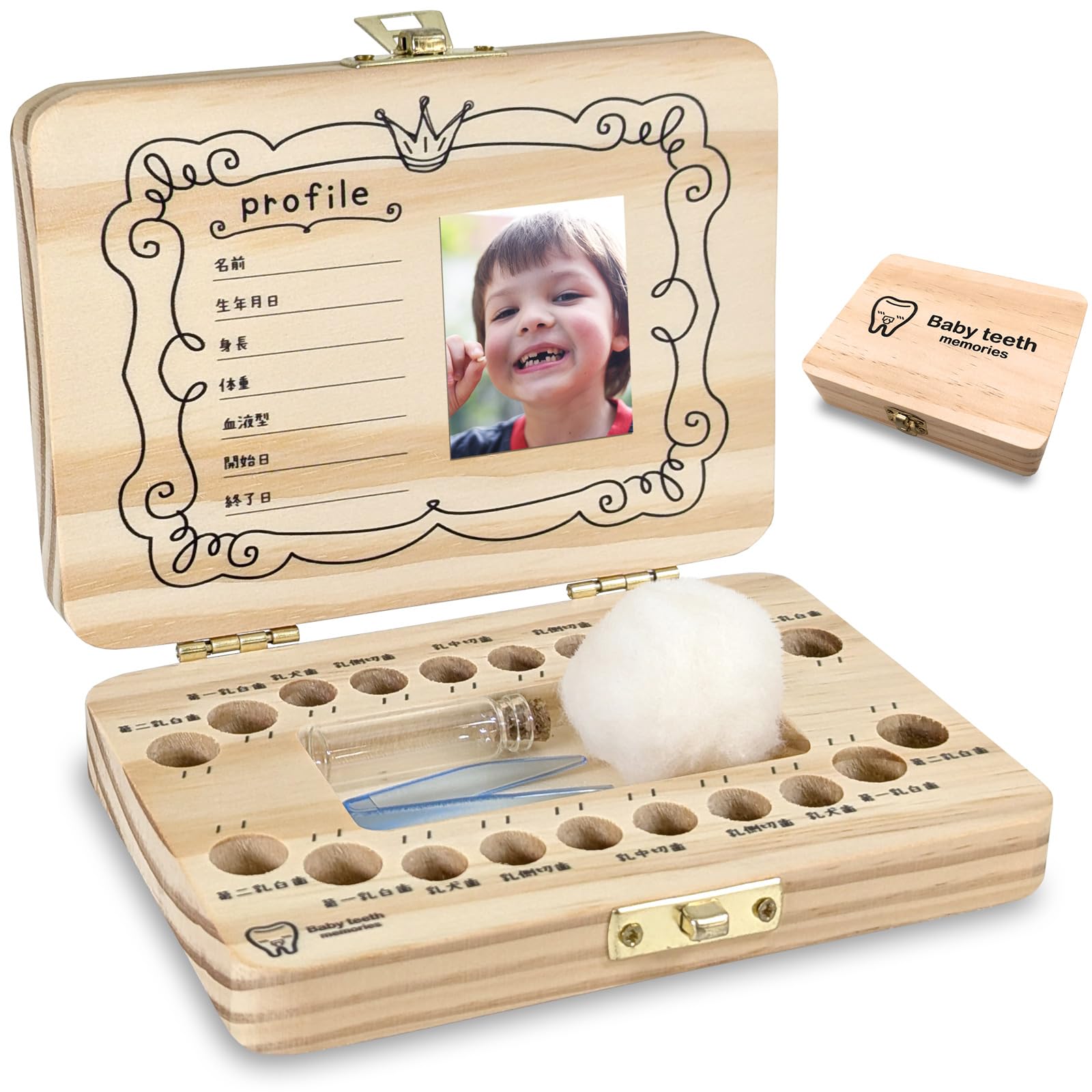 【使用方法】 プロフィール欄にお子様の情報をボールペンでご記入頂き、空いたスペースにお気に入りの写真をノリや紙用ボンドなどで貼り付けてください。乳歯を入れる穴は全20カ所あるので、乳歯が抜けたら可能な限りキレイに洗い、該当する穴に入れてミニピンセット等を使って綿で蓋をしてください。穴の上またしは下に抜けた年月日を記入していきます。髪の毛が生え始めたら、小瓶にうぶ毛を入れて、蓋をしっかりしてケース中央の窪みで保管をしてください。 <保管方法>木材の為、直射日光や多湿を避けて保管してください。 【ギフト プレゼント】 お子様には勿論、友人の出産祝いや孫へのプレゼントにも最適です。 【ご注意】当店オリジナルデザインの乳歯ケース(シンプル)のデザインをほぼ丸パクリしている偽物がございますのでご注意ください。また文字を記載していただく際は、マジックペンではなくボールペンで記載をお願いします。木材の特性上、マジックペンで記載してしまうと木に滲み文字がつぶれてしまいますのでご注意くださいませ。