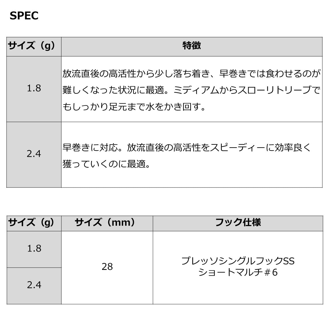 放流直後の高活性から少し落ち着き、早巻きでは食わせるのが難しくなった状況に最適。ミディアムからスローリトリーブでもしっかり足元まで水をかき回す。