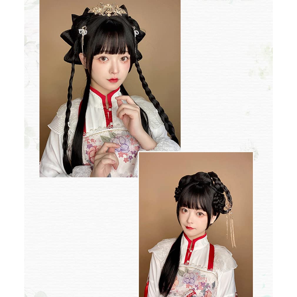 ウィッグ 原宿風 GAL系 ロリータ セット 姫カット お団子ヘア お下げ ロング 黒 かつら カツラ 耐熱 変装用ウィッグ リボン コスチューム小物 パーティー お祭り イベント cosplay wig (ロングウィッグ+ツインテール)