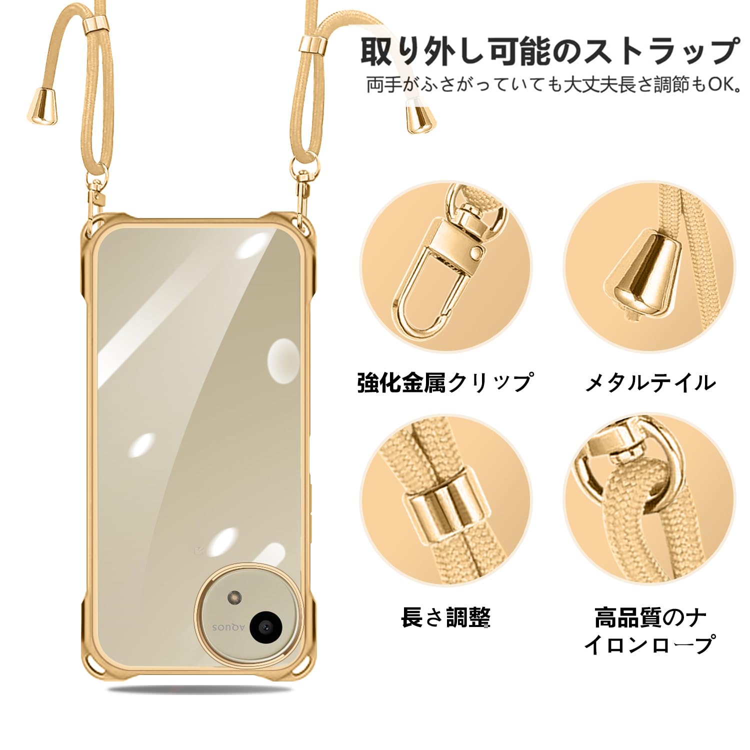 AQUOS Wish4 用 ケース クリア ショルダー aquos wish4 SH-52E 用 スマホケース アクオス ウィッシュ4 カバー 肩掛け 斜めかけ 縄掛けケース 透明 薄型 軽量 TPU 携帯ケース 紐付き 斜めがけ 織りストラップ付き ネックストラップ ショルダー ケース 縦/横 2WAY 長さ調整可能 取り外し可能 落下防止 紛失防止 ワイヤレス充電対応 (ゴールド)