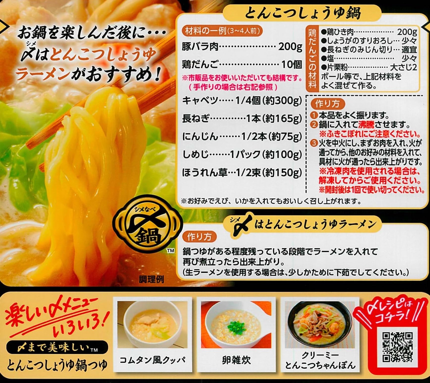 〆は ラーメン を推奨。 鍋の素 としてだけでなく ラーメンスープ 等、 スープ の素 としてもお使いいただける なべつゆ です