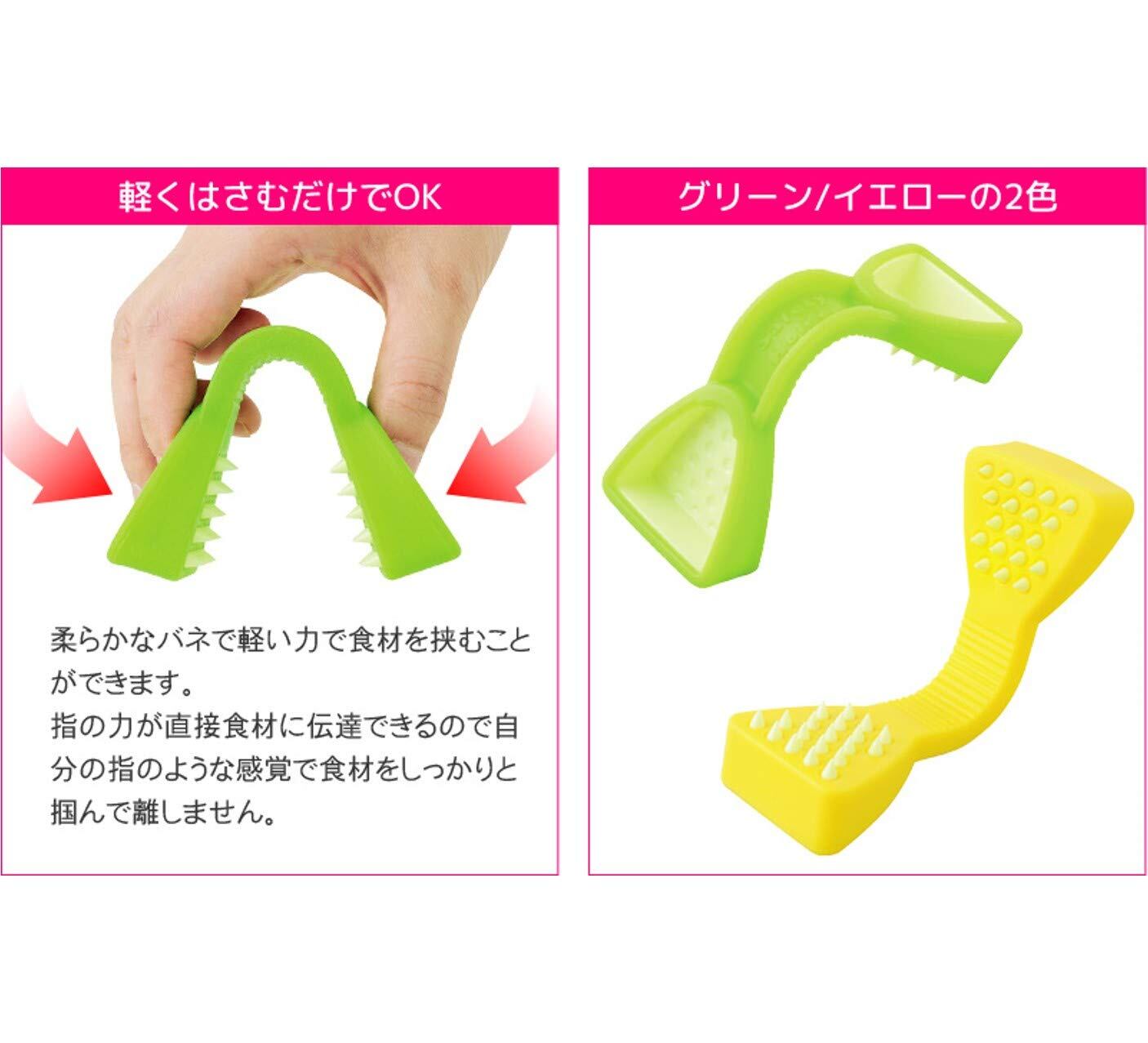 3本の指で軽く挟むだけでOK!ボディが自立するのでワンタッチで装着。柔らかなバネで軽い力で食材を掴むことができる