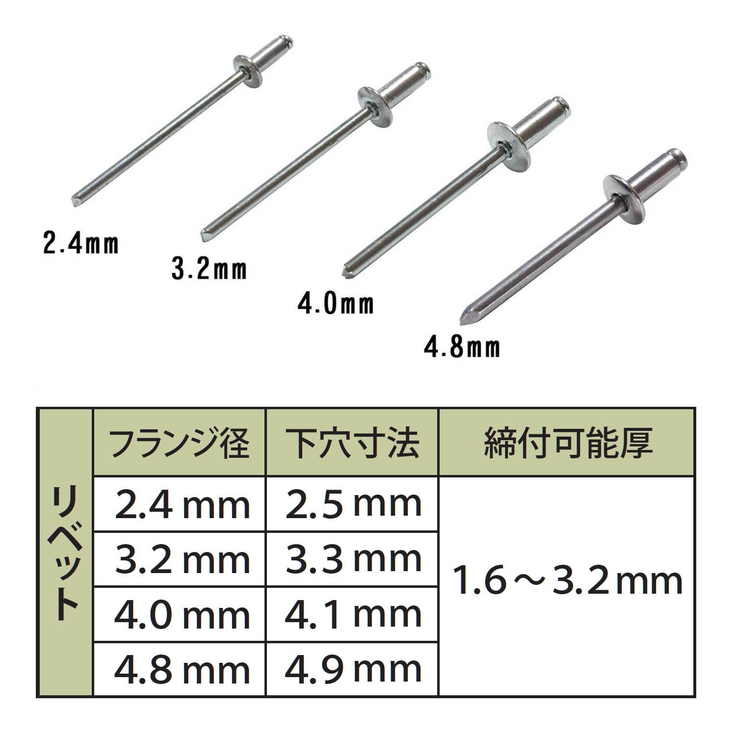 適応リベットサイズ(mm):2.4、3.2、4.0、4.8