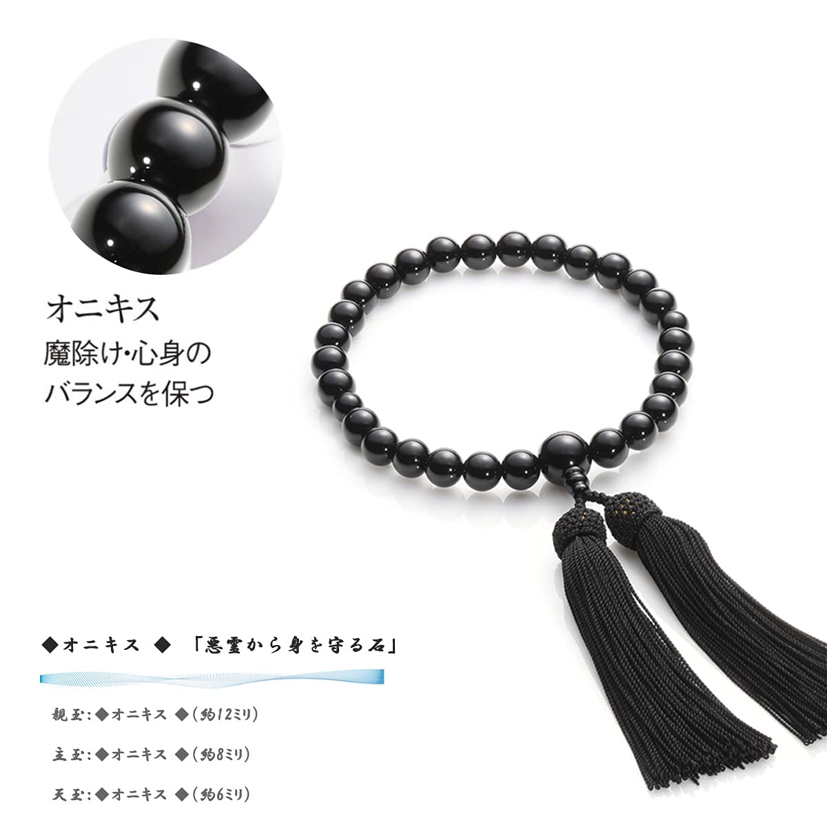 【数珠素材】:●親玉:オニキス(約10ミリ) ●主玉:オニキス(約7ミリ)●天玉:オニキス(約5ミリ)●房の素材:正絹頭付房(黒色)