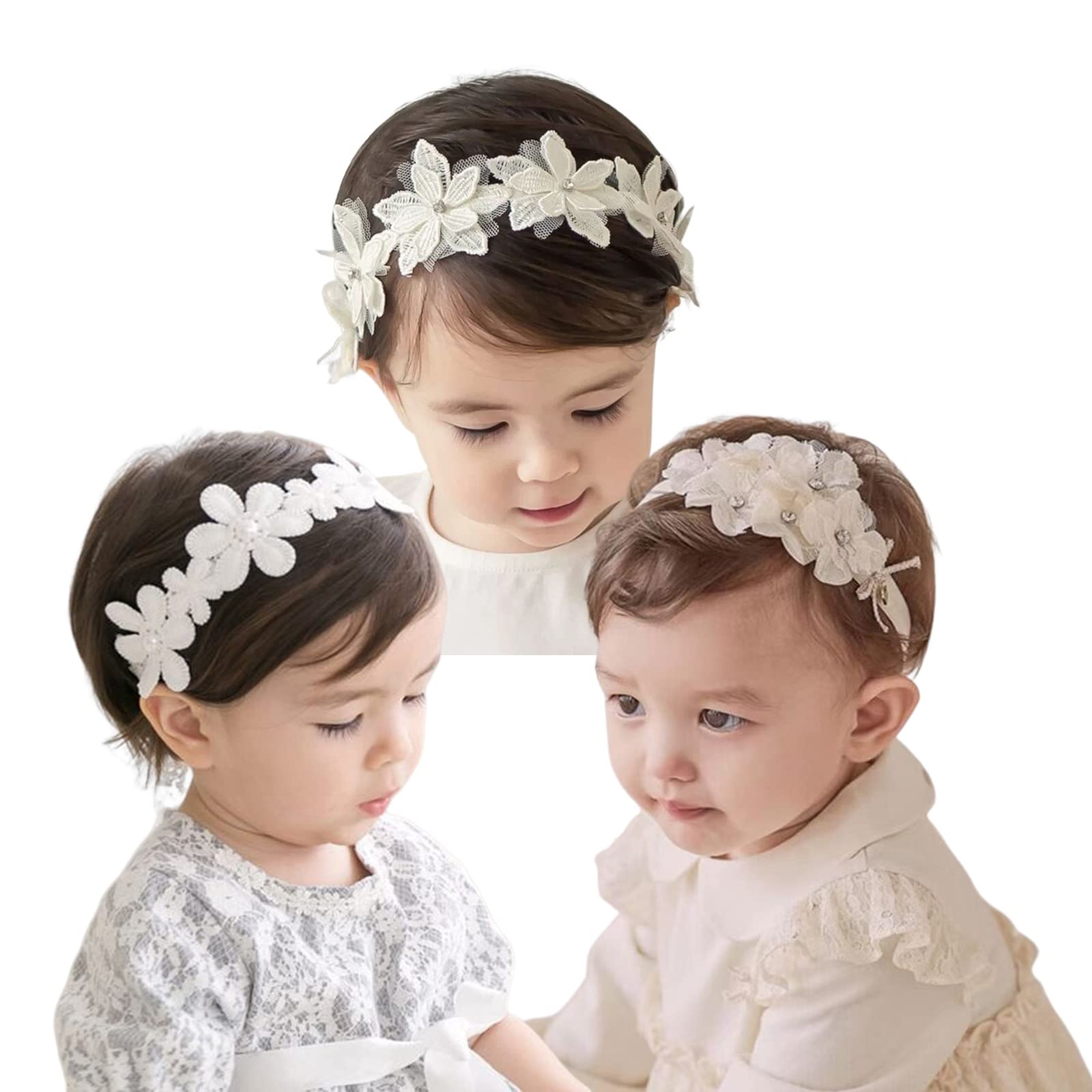 DFsucces ヘアバンド ベビー ゴ ヘアアクセサリー 髪飾り レースバンド ヘッドドレス 女の子 新生児 出産祝い 誕生日 記念撮影 お祝い 結婚式 3点セット (ホワイト)