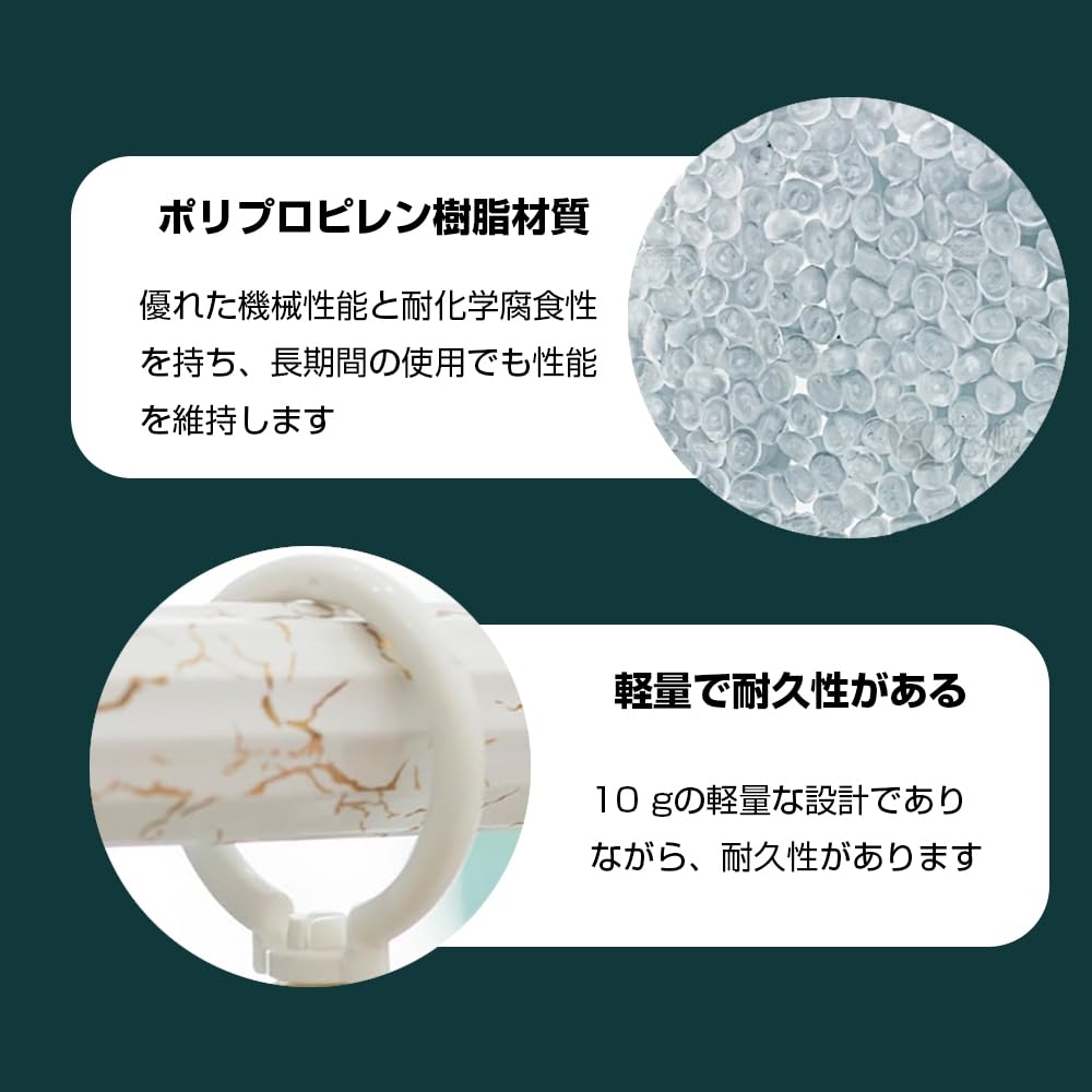 【詳細パラメータ】このカーテンリングは20種類のセットで販売されており、単体の本体サイズは幅4.7 cmx高さ6.1 cmで、カーテンリング1つの重さはわずか10 gで、軽量で耐久性を失わない。主な材質はポリプロピレン樹脂を選択し、この材料は優れた機械性能と耐化学腐食性を持ち、カーテンリングが長期使用中にも良好な性能表現を維持できることを確保する。
