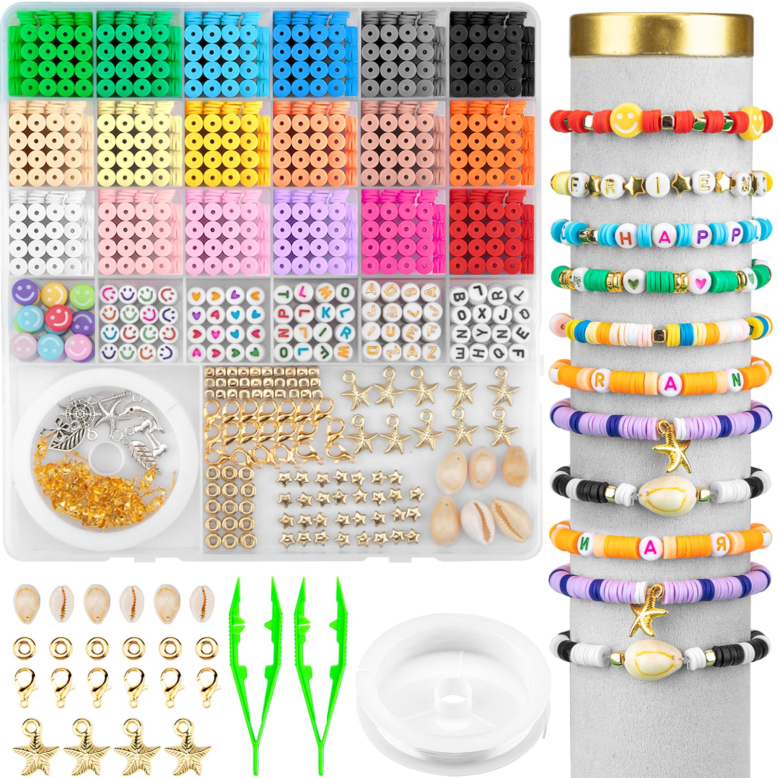 4000個ブレスレット作成キット用の粘土ビーズ、弾性紐とピンセット付き、ソフトセラミックチップアルファベット文字ビーズスマイリーフェイスビーズとフラットビーズ、ジュエリー作成キットクラフト女の子用