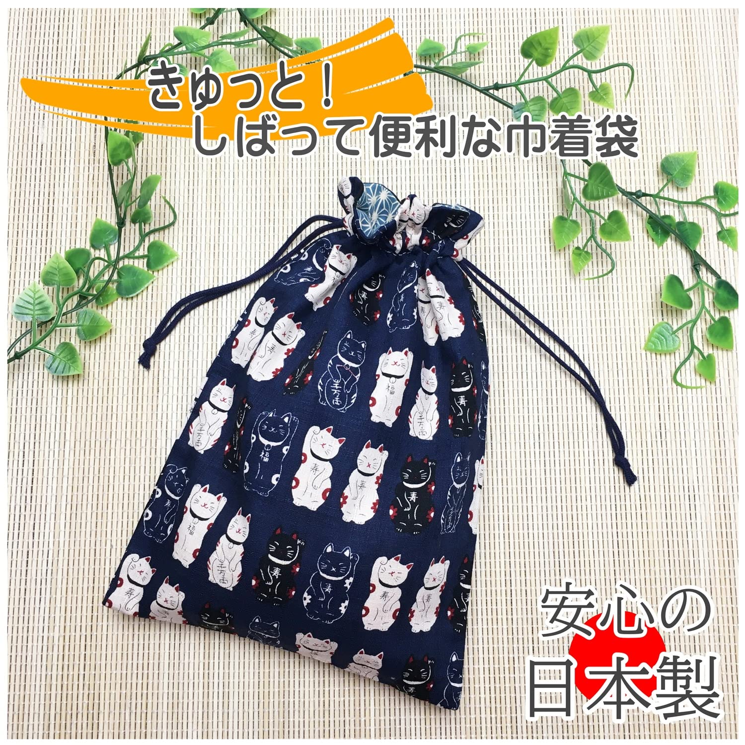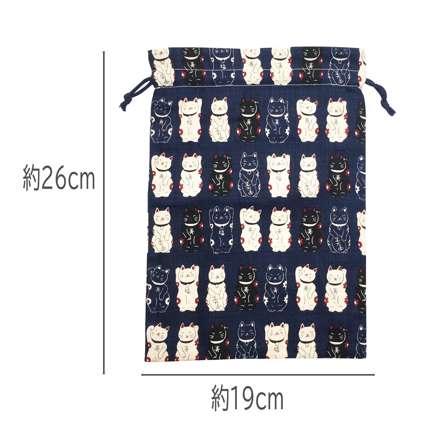 巾着 御朱印帳入れ 日本製 小物入れ 裏地付 猫柄 和雑貨 和柄 巾着袋 ki-155 (06 招き猫 紺)