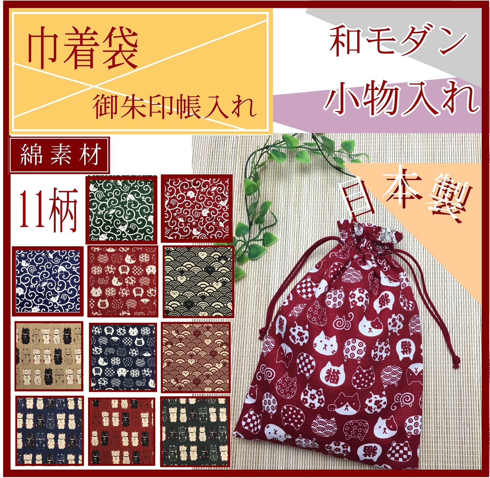 きゅっと、しばって便利な巾着袋です。サイズも大きめなので御朱印帳も1~2冊は入ります。 内布(裏地)付で二重生地で丈夫です。内布もかわいい和柄になつています。(リバーシブルではありません)猫柄巾着です。 御朱印帳袋、小物入れ、バックインバック、旅行セット袋、など、使い方いろいろです。 安心の日本製です。猫好きの方へのプレゼントにもおススメです。かわいい猫たちに癒されてお使いください。 【生産地】 日本製 【素材】 綿 【サイズ】 縦約26.0cm 横約19.0cm 【重量】 約30g