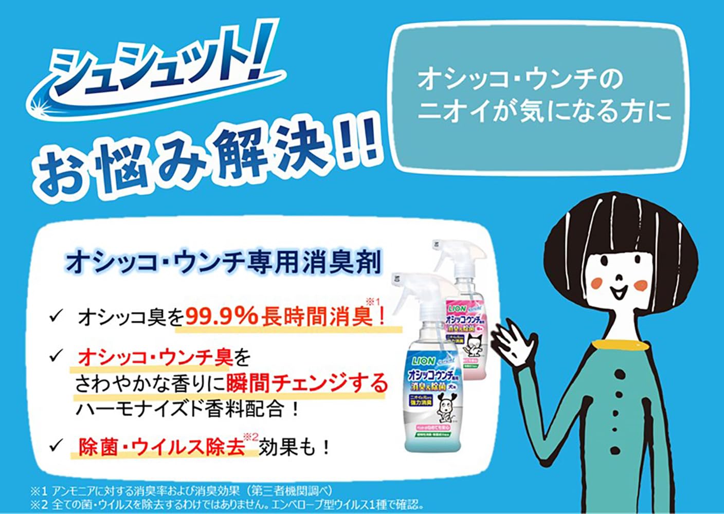 オシッコ臭を99.9%強力消臭、長時間効果が続きます*1。オシッコ・ウンチ臭をさわやかな香り(微香性)に瞬間チェンジするハーモナイズド(調和)香料配合。菌の増殖を抑え*2、ペット周りの清潔を長く保ちます。植物性消臭・除菌成分配合。99%除菌・ウイルス除去*3。ペットがなめても安心。さわやかな草原の香り。